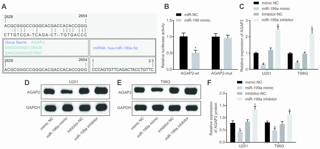 The targeted binding site of AGAP2 and miR-199a was predicted through bioinformatics database (microRNA.Org; http://www.microrna.org/micrornahome.dog/) (Figure 4A). To verify that AGAP2 is the direct target gene of miR-199a, a dual luciferase reporter gene assay was carried out to test this relationship. The results showed that compared with the control group, the luciferase activity of' AGAP2 wild-type (WT) 3’-untranslated region (UTR) was significantly inhibited when treated with miR-199a (p < 0.05), while that of mutant (MUT) 3’-UTR was not inhibited (Figure 4B). To further verify the effect of miR-199a on AGAP2, the expression of AGAP2 in U251 and T98G cell lines after over-expression or inhibition of miR-199a was determined by RT-qPCR and Western blot analysis. In glioma cells over-expressing miR-199a, the mRNA and protein expression of AGAP2 decreased significantly (p < 0.05). However, when we inhibited miR-199a, we observed an upregulation of AGAP2 expression (Figure 4C–4F). In summary, AGAP2 was a direct target gene of miR-199a, and miR-199a down-regulated the expression of AGAP2.