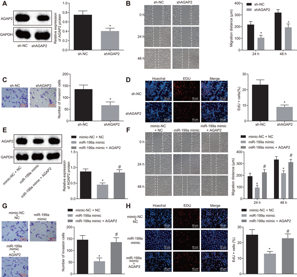 The effect of AGAP2 on the development of glioma cells was verified by AGAP2 gene silencing. The silencing efficiency of shAGAP2 was evaluated by Western blot analysis, which revealed a significant decline of AGAP2 in U251 cells (Figure 5A). The findings by Transwell assay, scratch test and EdU assay revealed that after AGAP2 silencing, the abilities of invasion, migration and proliferation of U251 cells decreased distinctly (Figure 5B–5D). Moreover, the co-transfection of miR-199a mimic and over-expressed AGAP2 was performed in glioma cells. It was shown that over-expression of miR-199a alone could inhibit the expression of AGAP2, and significantly attenuate the proliferation, migration and invasion of glioma cells (Figure 5E–5H). However, when AGAP2 was over-expressed in the cells transfected with the miR-199a mimic, we found the opposite effect of miR-199a on the glioma cells (Figure 5F–5H). These results suggested that the inhibitory role of miR-199a in U251 cells was mediated by down-regulation of AGAP2.