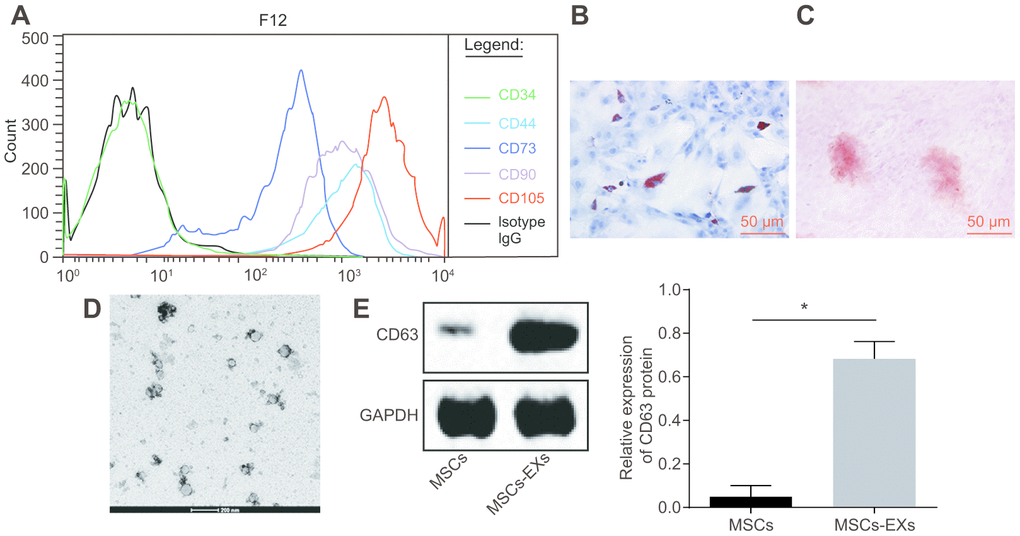 The presence of exosomes was isolated from the supernatant of hMSCs, and confirmed under a transmission electron microscope (TEM). The findings revealed the existence of exosomes in the supernatant of hMSCs. The shape of exosomes was solid and compact, and the majority was either cup-shaped or appeared globular. The sizes of the exosomes ranged from 50 to 200 nm (Figure 6D). Western blot analysis was employed for detection of CD63 protein which is a marker present on the surface of exosomes. We found that the expression of CD63 in exosomes was significantly higher than that in hMSCs which was used as the negative control (NC). These results further confirmed the success of exosome extraction (p < 0.05) (Figure 6E).