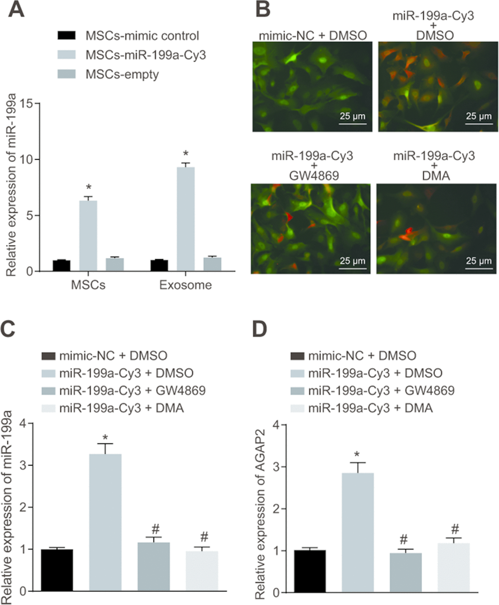 U-251 cells were transfected with pCDNA3.1-GFP, and hMSCs were transfected with Cy3-labelled miR-199a mimic (miR-199a-Cy3). The expression of miR-199a was measured in the MSC-miR-199a, MSC-NC and MSC-blank groups by RT-qPCR. We found a significant increase in miR-199a expression in hMSCs transfected with miR-199a-Cy3 compared to those transfected with miR-199a-NC and without any transfection (Figure 7A). This suggests that hMSCs can effectively release exosomes containing miR-199a. In order to prove that hMSCs deliver miR-199a to glioma cells by secreting exosomes, the hMSCs presented with Cy3 that were labeled as over-expressed miR-199a and U251 cells exhibited green fluorescence were co-cultured and observed under the fluorescence microscopy. The combined images showed that the transfected hMSCs could effectively transfer miR-199a into U251 cells, thereby highlighting the presence of exosomes (Figure 7B). Next, we employed GW4869 and DMA to reduce the exosome secretion for determination of the function of exosomes in this process. As illustrated in Figure 7C, the miR-199a expression was significantly inhibited in U251 cells during the co-culture experiment with GW4869 or DMA. To determine whether delivered miR-199a in vitro could effectively inhibit endogenous AGAP2 in glioma cells, the AGAP2 level in glioma cells co-cultured with hMSCs containing Cy3-labelled miR-199a was measured by RT-qPCR. AGAP2 expression in U251 cells was effectively inhibited by miR-199a in vitro, and this effect was significantly hindered by GW4869 and DMA (Figure 7D). Our results from this part of the study thereby demonstrate that exosomes contribute to miR-199a delivery from HMSCs into glioma cells via exosomes.