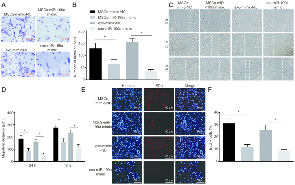 To determine whether the miR-199a released from the exosomes of hMSCs could regulate the biological function of U251 cells, the proliferation, invasion and migration abilities of U251 cells co-cultured with hMSCs or with hMSCs-derived exosome were analyzed by EdU assay, Transwell assay and scratch test. The results showed that the proliferation, invasion and migration of U251 glioma cells were inhibited after miR-199a treatment in a co-culture system with either hMSCs or hMSCs-derived exosomes (Figure 8A–8F). This suggests that hMSCs could inhibit the proliferation, invasion and migration of glioma cells by delivering miR-199a to U251 cells, thereby exerting an anti-tumor effect via release of exosomes.