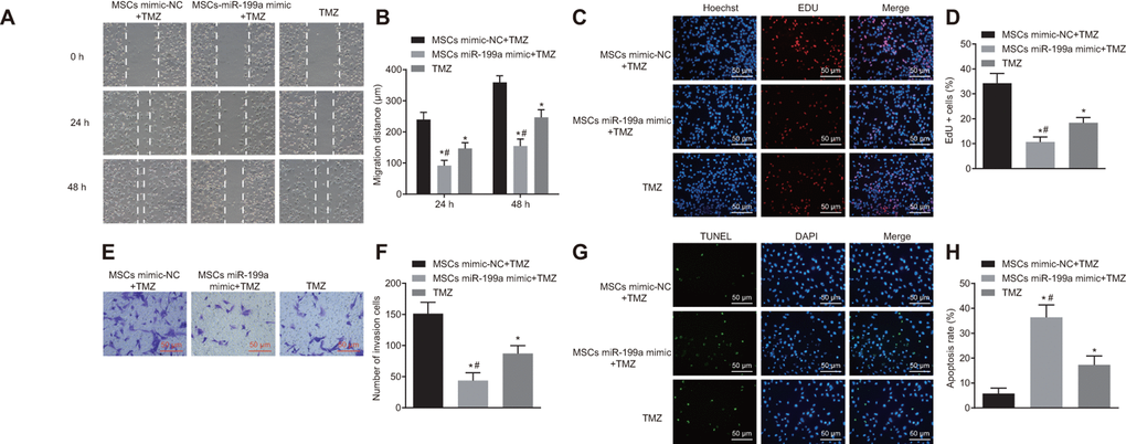 To investigate the chemotherapeutic effect of over-expressed miR-199a on the glioma, U251 cells were treated with MSCs-miR-199a mimic and temozolomide (TMZ) in vitro. Migration and invasion of U251 cells were assessed by scratch test and Transwell assay. We found that TMZ alone could inhibit the migration and invasion of glioma cells, and that the addition of MSCs-miR-199a helped strengthened the inhibition potency (Figure 9A–9D). Meanwhile, the viability of U251 cells was evaluated after the treatment of TMZ by EdU assay. Results showed that TMZ alone could significantly inhibit the viability of U251 cells, while miR-199a delivered by hMSCs enhanced the inhibitory effects (Figure 9E–9F). To investigate the effects of the combination of TMZ and hMSCs on glioma cell apoptosis, terminal deoxynucleotidyl transferase-mediated dUTP nick-end labeling (TUNEL) analysis was conducted. The results revealed that hMSCs delivery of miR-199a, when combined with TMZ, significantly promoted U251 cell apoptosis compared to the single treatment with hMSCs miR-NC or TMZ (Figure 9G–9H). Overall, delivering of miR-199a by hMSCs enhanced the chemosensitivity to glioma.