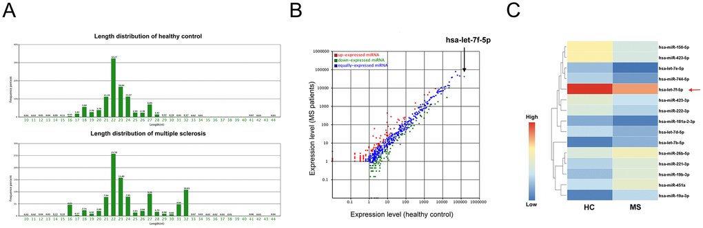 High-throughput sequencing was performed for peripheral blood CD4+ T cells from MS patients and healthy controls (HC) using total RNA extracted from the cells of individuals from each group (CD4+ T cells sorted from ten individuals were pooled). The two samples contained small RNAs with a variety of lengths (Figure 1A), with numerous species of small RNA, including miRNAs, rRNAs, tRNAs and piRNAs, identified using bioinformatic tools after sequencing. A total of 996 and 979 miRNAs were identified in the MS patient and HC samples, respectively. Moreover, significant differences were observed between the miRNA expression profiles of the MS patients and the HC (Figure 1B).