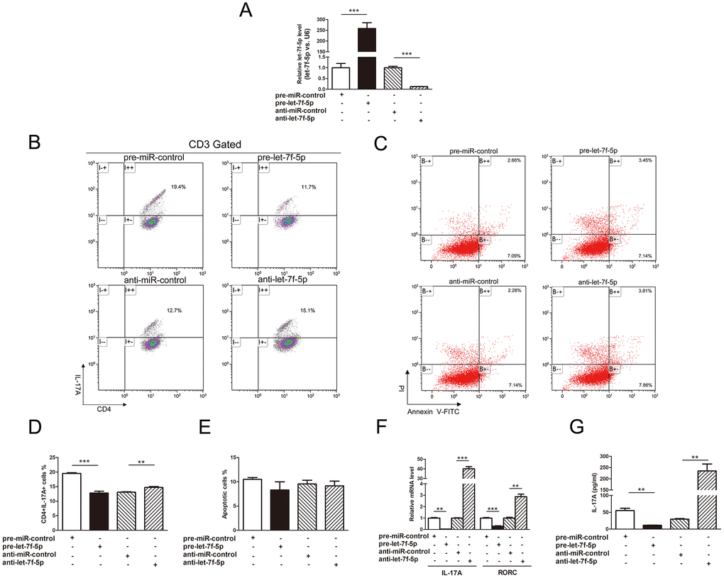 Induced mouse Th17 cells were cotransfected with pre-let-7f-5p, anti-let-7f-5p or negative control RNA. Subsequently, a mouse Th17 staining kit (MULTI SCIENCES, China) was used to analyze the cells after 96 h by FCM (Beckman Coulter, USA) following the manufacturer’s recommendations.
