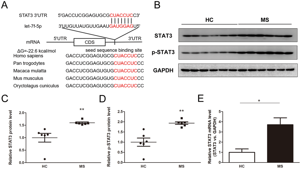 The levels of STAT3 and p-STAT3 were detected in the peripheral blood CD4+ T cells from the MS patients and HC, the results of which showed that the levels of both were dramatically increased in the MS patient samples compared with those from the HC (Figure 4B–4D). In addition, the expression of STAT3 at the mRNA level was significantly upregulated in the MS group compared with that in the HC (Figure 4E). Furthermore, the expression of let-7f-5p was inversely correlated with the levels of STAT3 and p-STAT3 (Supplementary Figure 2).