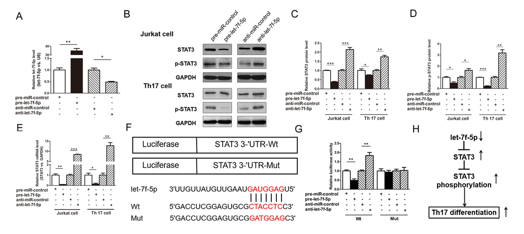 The ability of let-7f-5p to regulate STAT3 was evaluated by assessing STAT3 expression in Jurkat cells after the overexpression or knockdown of let-7f-5p. In these experiments, Jurkat cells were transfected with pre-let-7f-5p or anti-let-7f-5p to overexpress or knockdown let-7f-5p expression, respectively. As shown in Figure 5A, let-7f-5p was successfully overexpressed and knocked down in Jurkat cells. The protein levels of STAT3 and p-STAT3 were significantly decreased by the overexpression of let-7f-5p, whereas the knockdown of let-7f-5p expression significantly increased the levels of STAT3 and p-STAT3 protein in Jurkat cells (Figure 5B–5D). To determine the level at which let-7f-5p affects STAT3 expression, we assessed STAT3 mRNA expression in let-7f-5p-overexpressing or let-7f-5p-knockdown Jurkat cells. Both the overexpression and knockdown of let-7f-5p influenced STAT3 mRNA levels, indicating that let-7f-5p regulates the STAT3 protein level at the transcriptional level (Figure 5E). To confirm the results of these experiments, we repeated the above experiments in induced mouse Th17 cells and observed consistent results (Figure 5A–5E).
