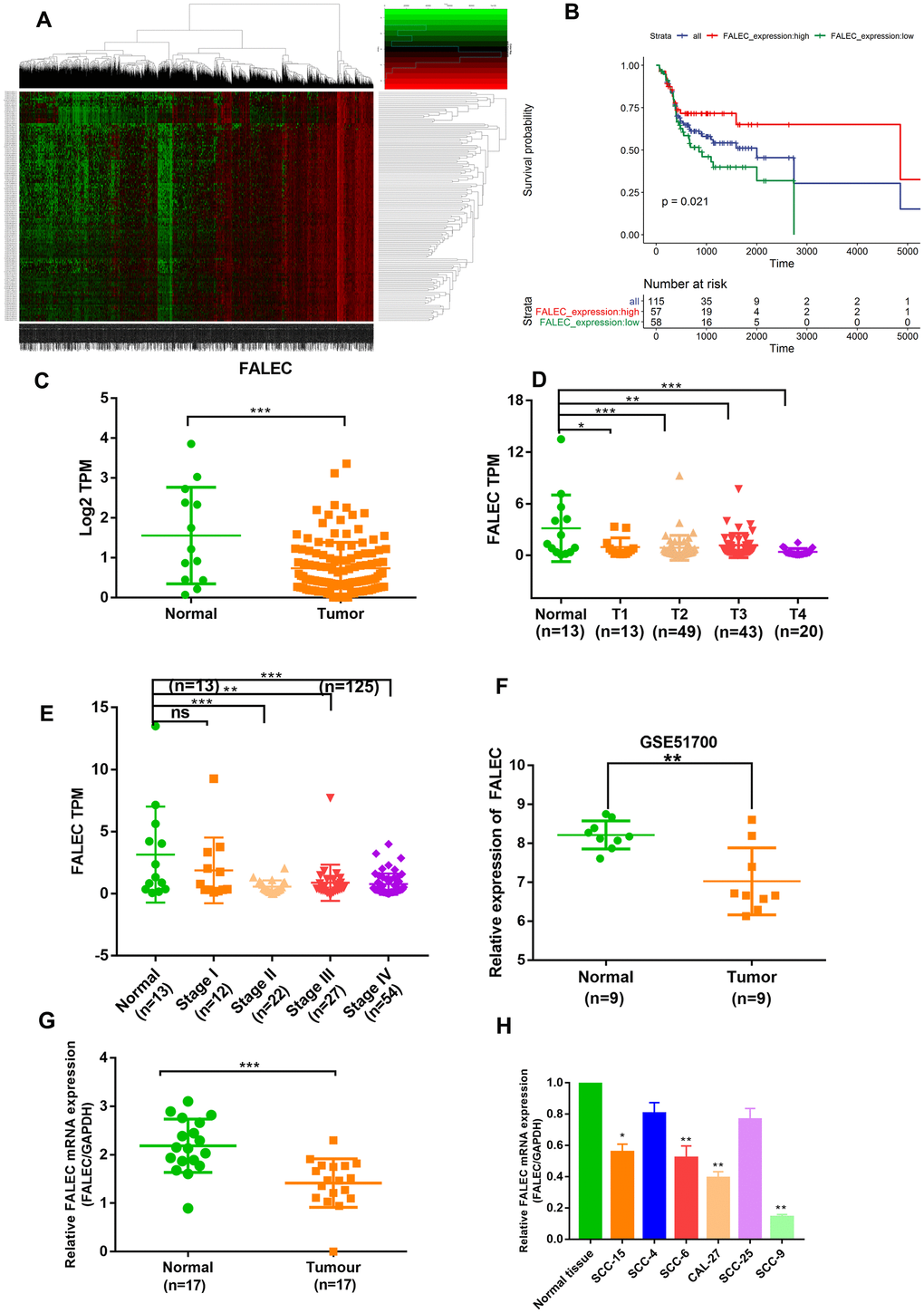 In order to explore lncRNAs involved in the progression of TSCC, we analyzed the lncRNA expression profile in pre-therapy biopsies of TSCC samples and normal samples from TCGA datasets. A mound of aberrant lncRNAs with statistically significant difference was found (Figure 1A). Kaplan-Meier survival analysis of different lncRNAs was conducted. The results showed that FALEC expression was lower in tumor tissues than in normal tissues and associated with positive prognosis in the TCGA datasets (Figure 1B–1E). Furthermore, the univariate analysis between FALEC expression levels in tongue squamous cell carcinoma (TSCC) tissues and clinicopathologic characteristics were determined. As shown in Supplementary Table 4, FALEC was significantly correlated with T classification (P < 0.05). In addition, FALEC expression was downregulated in TSCC tissues compared with both adjacent normal tissues in GEO51700 and fresh frozen tissues (Figure 1F and 1G). The expression of FALEC in normal tongue tissue was higher than TSCC cell lines (SCC-15, SCC-4, SCC-6, SCC-27, SCC-25, SCC-9) as detected by RT-qPCR (Figure 1H). These data indicate that FALEC was significantly downregulated in TSCC and may be a marker for good prognosis in TSCC patients.