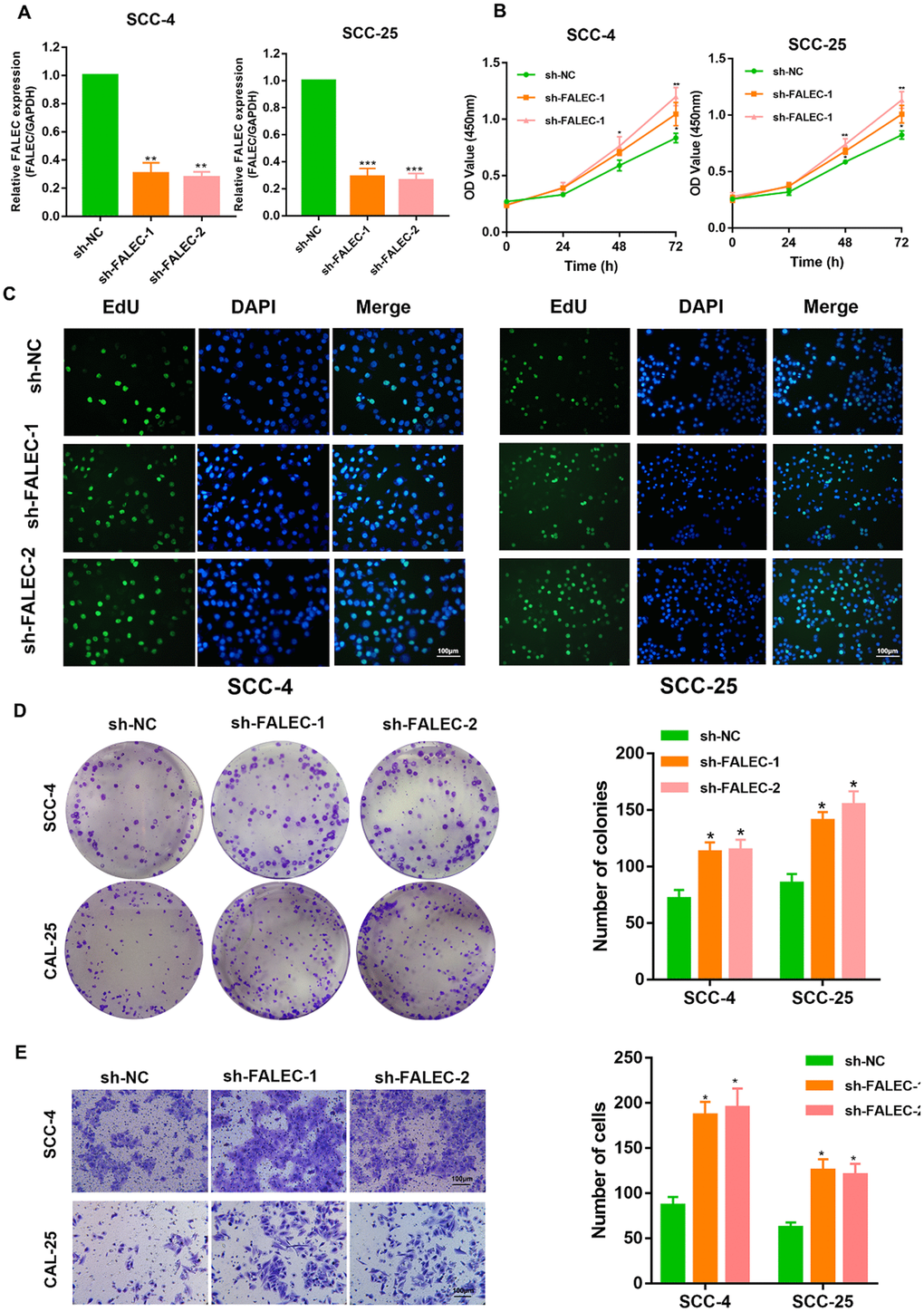 To investigate the role of FALEC in TSCC, FALEC knockdown TSCC cells were developed through two independent short hairpin RNAs (shRNAs) (Figure 2A). CCK-8 assays revealed that FALEC knockdown significantly increased cell viability in both SCC-25 and SCC-4 cell lines compared to the control cells. EdU cell proliferation assays showed that silencing of FALEC dramatically promoted the proliferation of TSCC cells (Figure 2C). Additionally, knockdown of FALEC elicited enhanced colony formation (Figure 2D). Transwell assays as well as wound healing assays showed that knockdown of FALEC dramatically increased the migration of cells (Figure 2E and Supplementary Figure 1A–1B).