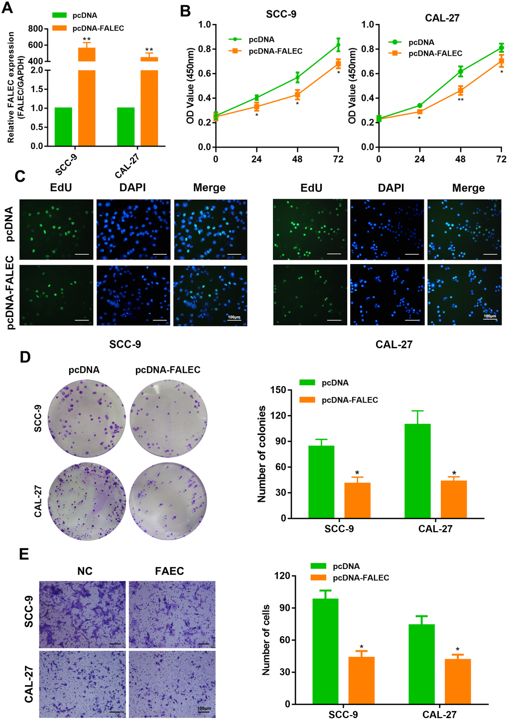 We examined the effect of ectopic expression of FALEC in TSCC cells. SCC-9 and CAL-27 were selected and infected with plasmids overexpressing FALEC (Figure 3A). As expected, overexpression of FALEC inhibited cell viability and cell proliferation as found by CCK-8 and EdU assays (Figure 3B and 3C). FALEC-overexpressing cells also reduced clone numbers compared to control groups (Figure 3D). Furthermore, enforced expression of FALEC resulted in a dramatic decrease in migration ability of SCC-9 and CAL-27 as illustrated by transwell assays and wound healing assays (Figure 3E and Supplementary Figure 1C), indicating that overexpression of FALEC could restrain TSCC cell proliferation and migration.