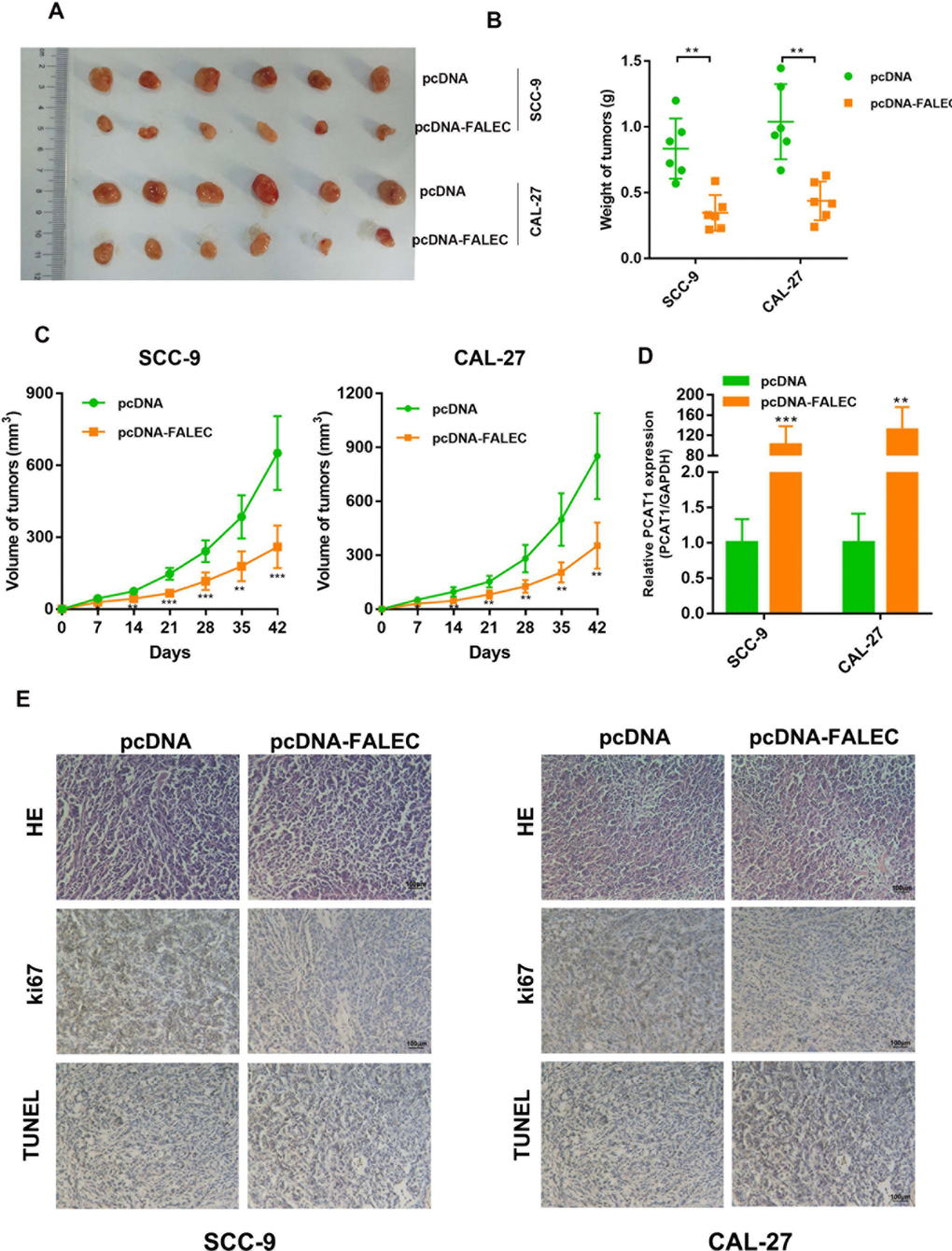 To investigate the effect of FALEC on the TSCC cell tumorigenesis in vivo, SCC-9 and CAL-27 cells overexpressing FALEC were subcutaneously transplanted into nude mice. As shown in Figure 4A–4C, a difference in tumor growth was observed between cells overexpressing FALEC and controls. The expression of FALEC in grafted tumor tissues was also confirmed by RT-qPCR. Moreover, immunohistochemistry (IHC) analysis of xenografted tumors showed that SCC-9 and CAL-27 cells with FALEC overexpression had significantly low cell proliferation rate (Ki-67) and high rate of apoptosis (TUNEL). Therefore, the data confirmed that FALEC suppressed the TSCC cell tumorigenesis in vivo.