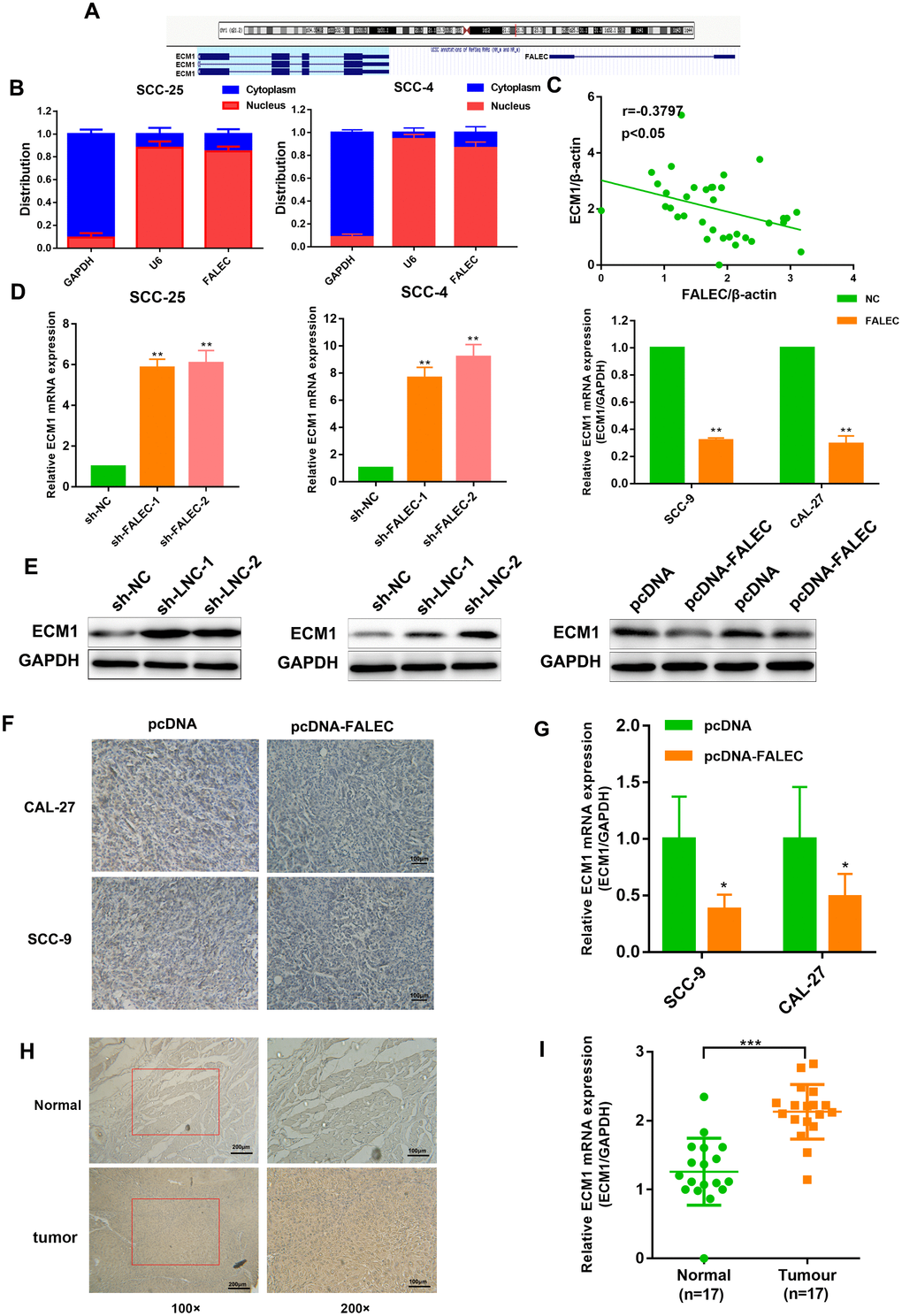 LncRNAs could act as local regulators to regulate the expression of its nearby genes, named regulation “in cis” [14], inspiring us to investigate whether FALEC could regulate its neighboring genes. According to bioinformatics and gene sequence analysis, Extracellular matrix protein 1 (ECM1), a widely reported oncogene involved in the progression and metastasis of many tumors, located upstream of FALEC (Figure 5A). The subcellular distribution assays revealed that FALEC was predominately located in the nucleus (Figure 5B), suggesting its role as a intranuclear regulator. Pearson’s correlation showed that the levels of FALEC were negatively correlated with that of ECM1 in primary TSCC samples and normal samples (Figure 5C). RT-qPCR and western blot analysis indicate that overexpression of FALEC resulted in a decreased expression of ECM1, while, knockdown of FALEC increased ECM1 levels (Figure 5D and 5E). In addition, IHC as well as RT-qPCR results of ECM1 expression derived from xenografted tumors showed the same trend (Figure 5F and 5G). Moreover, an increased positive rate of ECM1 was observed in TSCC tissues rather than adjacent tissues by IHC, which was additionally verified in paired cancer adjacent tissues from 17 patients by RT-qPCR (Figure 5H and 5I). These data suggested ECM1 was negatively regulated by FALEC.