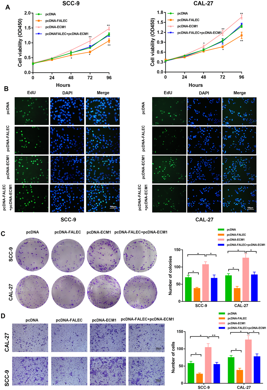 Next, we determined the role of ECM1 in FALEC-induced suppression of TSCC cells. ECM1 upregulation significantly promoted the proliferation of TSCC cells and enhanced their migration in vitro. Additionally, ECM1 overexpression also rescued the repressive roles of FALEC on the malignant behaviors of TSCC cells, as illustrated by CCK-8, EdU cell proliferation assays, colony formation assays and transwell assays (Figure 6A–6D).