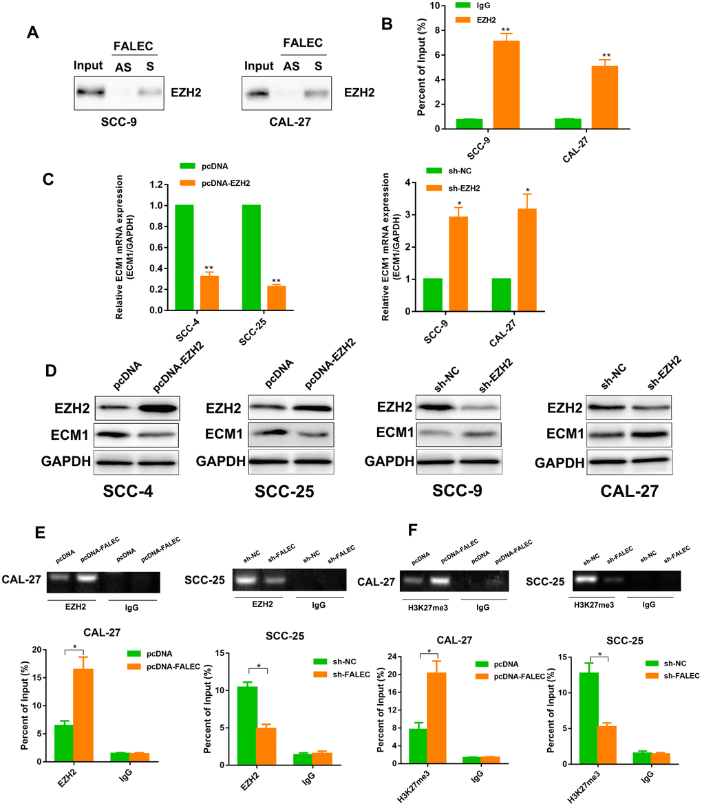 Recent studies demonstrated that lncRNAs could modulate gene silencing in cooperation with chromatin modifying enzymes, including Polycomb repressive complex 2 (PRC2). EZH2 was the catalytic subunit of the PRC2, reported to epigenetically repress transcription of specific genes [15]. To investigate whether FALEC could mediate its regulation via a similar mechanism, RNA pull-down assays as well as RNA immunoprecipitation (RIP) with antibodies against EZH2 in TSCC cells were performed. The interaction specificity between FALEC and EZH2 was confirmed (Figure 7A and 7B). Next, results of RT-qPCR and western blot confirmed the downregulation of ECM1 when EZH2 was overexpressed, in contrast, both mRNA and protein levels of ECM1 were downregulated when EZH2 was knocked out (Figure 7C and 7D). To further determine FALEC inhibited transcription through recruiting EZH2 to the promoter of ECM1, chromatin immunoprecipitation (ChIP) analysis was carried out. Results revealed that EZH2 bound to the promoter of ECM1 induced H3K27me3 modifications. FALEC knockdown decreased EZH2’ binding as compared to the control group, whereas, the recruitment of EZH2 and H3K27me3 levels in the promoter of ECM1 increased when FALEC was overexpressed (Figure 7E and 7F). These data confirmed that EZH2 could directly bind to the promoter of ECM1 mediating H3K27me3 methylation with the help of FALEC.