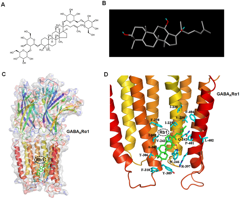 Molecular modelling was performed using Sybyl-x 2.1 software from Tripos Inc. (St. Louis, MO). GABAA and GABAB receptor structures used for molecular docking were obtained from the Protein Data Bank (PDB, http://www.rcsb.org; PDB 6CDU for GABAA receptor, 4MS1 and 4MS4 for GABAB receptor). The molecular construction of Rb1 was performed using the "Sketch" module of Sybyl x-2.1, and the 2D structure of Rb1 is shown in Figure 1A.