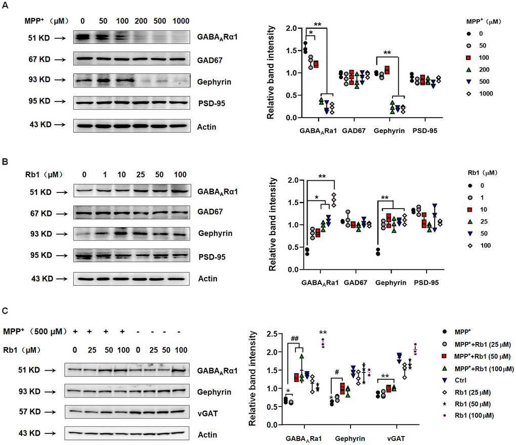 Since Rb1 may bind the TMD domain of GABAARα1, we then examined whether Rb1 can increase GABAARα1 expression. Using SH-SY5Y cell, we found that 200, 500 and 1000 μM MPP+ dramatically decreased the expression of GABAARα1 and gephyrin, an inhibitory postsynaptic anchoring protein (GABAARα1: F 5, 12 = 131.3, P < 0.001, post-hoc P = 0.0146 for 100 μM MPP+, P < 0.001 for 200, 500 and 1000 μM MPP+; gephyrin: F 5, 12 = 158.2, P < 0.001, post-hoc P < 0.001 for 200, 500 and 1000 μM MPP+; Figure 2A). While MPP+ showed no obvious effects on the glutamic acid decarboxylase 67 (GAD67, a GABA-synthesizing enzyme) and postsynaptic density-95 (PSD-95, an excitatory postsynaptic anchoring protein) (Figure 2A). Moreover, 25, 50 and 100 μM Rb1 increased GABAARα1 expression and 1, 10, 25, 50 and 100 μM Rb1 increased gephyrin expression in SH-SY5Y cell (GABAARα1: F 5, 12 = 58.68, P < 0.001, post-hoc P = 0.021 for 25 μM Rb1, P = 0.0243 for 50 μM Rb1, P < 0.001 for 100 μM Rb1; gephyrin: F 5, 12 = 26.02, P < 0.001, post-hoc P < 0.001 for 25, 50 and 100 μM Rb1; Figure 2B). Both MPP+ and Rb1 showed no obvious effects on the GAD67 and PSD-95 expression (Figure 2B). We further showed that both 50 and 100 μM Rb1 recused GABAARα1 and 50 μM Rb1 increased gephyrin expression (GABAARα1: F 7, 16 = 33.33, P < 0.001, post-hoc P = 0.0025 for MPP++50 μM Rb1 vs MPP+, P = 0.0001 for MPP++100 μM Rb1 vs MPP+; gephyrin: F 7, 16 = 20.58, P < 0.001, post-hoc P = 0.0233 for MPP++50 μM Rb1 vs MPP+; Figure 2C), while Rb1 showed no obvious effects on the vesicular GABA transporter (vGAT) expression in MPP+-treated SH-SY5Y cell (Figure 2C). Thus, we verified Rb1 can increased GABAARα1 and postsynaptic gephyrin expression in normal and MPP+-treated SH-SY5Y cell.