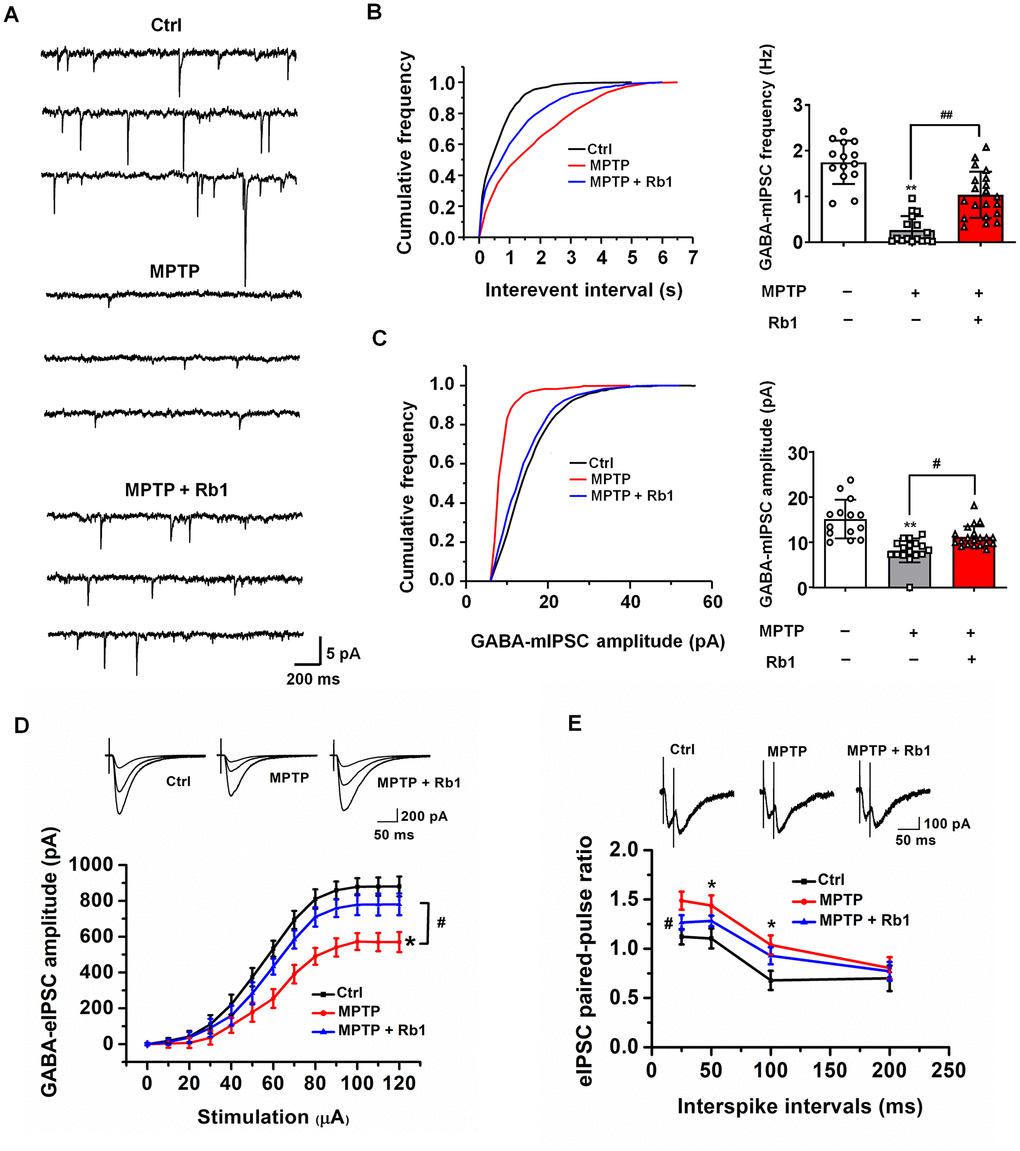 Since we found Rb1 upregulated GABAA receptor and postsynaptic inhibitory protein expression, we then examined whether Rb1 regulates GABAergic transmission in the PFC in MPTP-treated mice by using electrophysiology and GABA-chemical exchange saturation transfer (CEST) magnetic resonance imaging (MRI) (GABA-CEST MRI).
