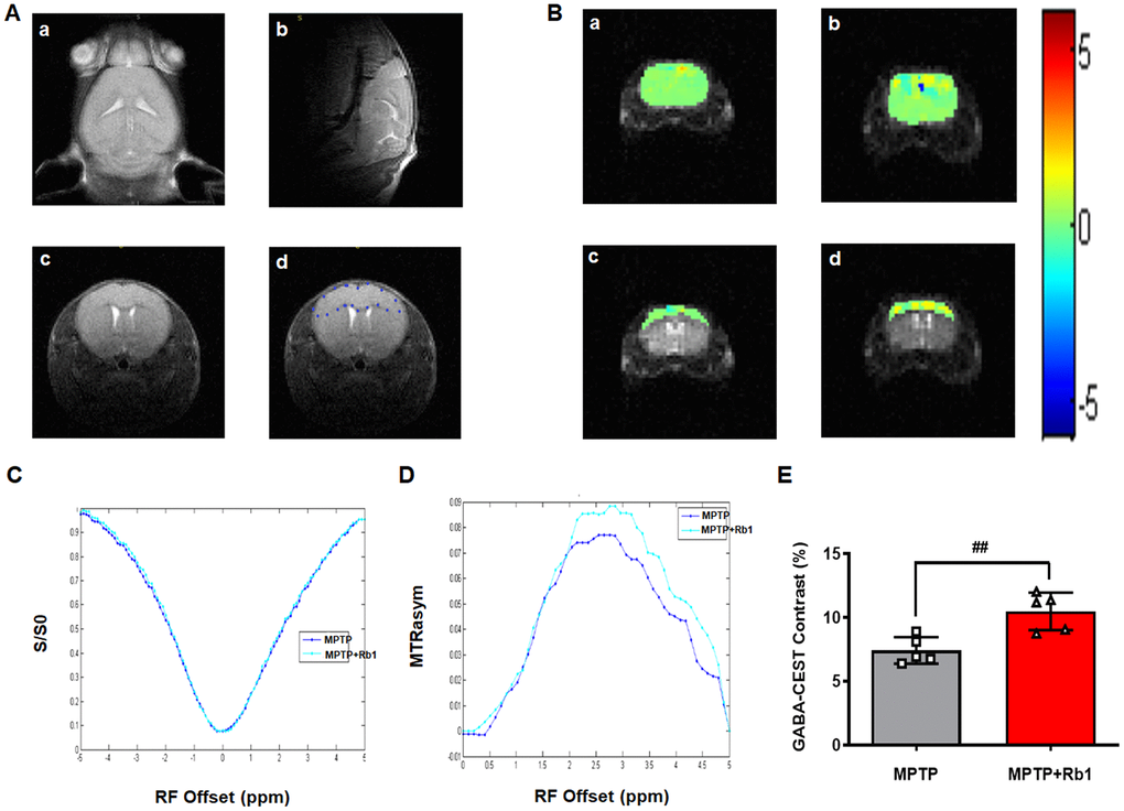 GABA-CEST MRI was performed as reported in our previous study [75]. Briefly, GABA-CEST MRI was acquired on a 7.0 T small-animal MRI scanner (Agilent Technologies, USA), using a TimeMedical surface coil (TimeMedical Technologies, China). This study tested five MPTP-treated mice and five mice treated with MPTP and Rb1 (MPTP+Rb1). Mice were anesthetized using 1.5–2% isoflurane mixed with O2 at a flow rate of 1 L/min and settled into the animal holder inside the volume coil of the MRI scanner. An MRI-compatible small-animal monitoring system (SAII Technologies, USA) was used to monitor respiration and body temperature. Body temperature was maintained at 37°C using air blown through a heater (SAII Technologies, USA).