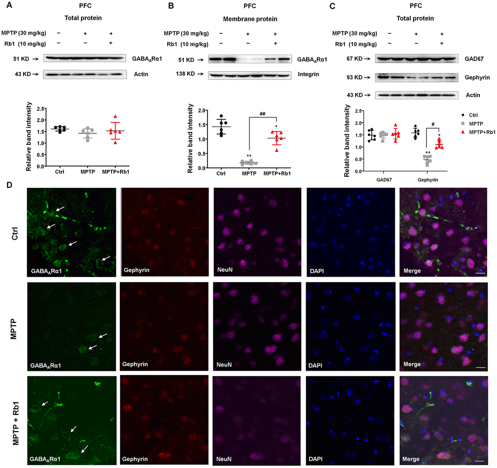 Since we found that Rb1 promoted prefrontal cortical GABAergic transmission in the MPTP mouse model, we then investigated whether Rb1 increased GABAA receptor in PFC in MPTP-treated mice. We found that MPTP and Rb1 did not alter the overall expression of GABAARα1 (Figure 6A), however, MPTP significantly decreased GABAARα1 expression at the cell membrane (F 2, 15 = 60.08, P < 0.001, post-hoc P = 0.0001; Figure 6B). In addition, Rb1 treatment restored the membrane expression of GABAARα1 (F 2, 15 = 60.08, P < 0.001, post-hoc P < 0.001; Figure 6B). Previous studies found that gephyrin stabilized GABAA receptors at the PSD, and postsynaptic gephyrin clusters regulated the surface expression of GABAA receptors [28–30]. Here we reported that Rb1 showed no effects on the GAD67 expression, but it increased gephyrin expression in the MPTP-treated mice (F 2, 15 = 69.91, P < 0.001, post-hoc P = 0.016; Figure 6C). In addition, we also found that Rb1 prevented MPTP-induced decrease of GABAARα1 expression in the PFC (as indicated by the white arrows in Figure 6D). Then we could suggest that Rb1 prevented MPP+ or MPTP-decreased GABAARα1 expression in vitro and in vivo.