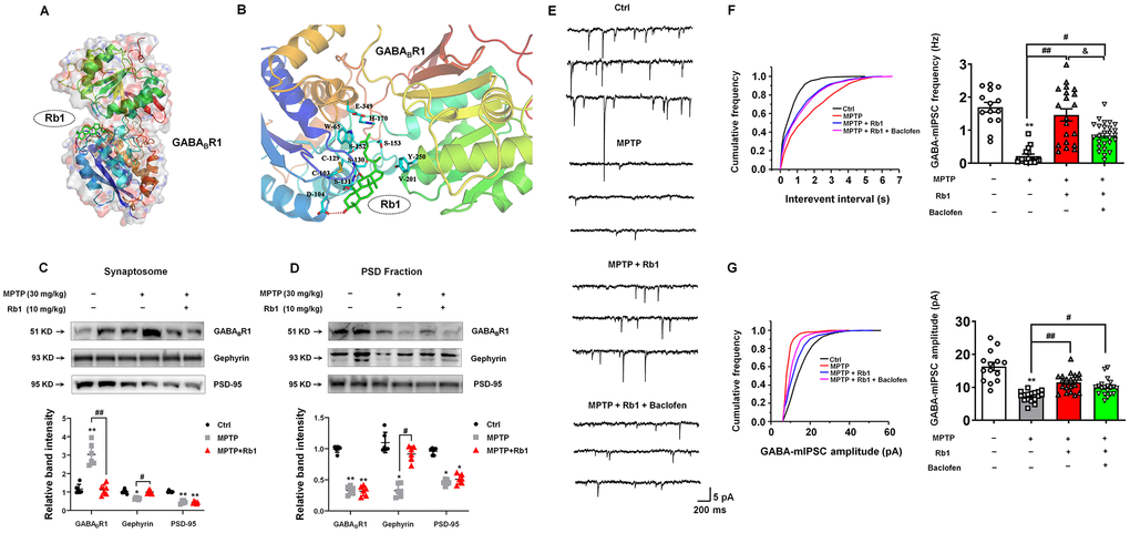 MPTP and MPP+ were purchased from Sigma-Aldrich (St. Louis, MO, USA). Ginsenoside Rb1 was purchased from MUST Biotechnology (Chengdu, China). Anti-GABAARα1 was purchased from Millipore (Bedford, MA, USA). Antibodies for anti-vGAT, anti-integrin, as well as the GABAB-receptor agonist Baclofen, were purchased from Santa Cruz Biotechnology (Santa Cruz, CA, USA). Anti-gephyrin, anti-PSD-95, and anti-GABABR1 were purchased from Cell Signaling Technology (Danvers, MA, USA). Anti-GAD67 was purchased from Thermo Scientific (Waltham, MA, USA). Anti-actin was purchased from Beyotime (Shanghai, China). Alexa Fluor 488-conjugated goat anti-mouse, Alexa Fluor 594-conjugated goat anti-rabbit, horseradish peroxidase (HRP)-conjugated goat anti-mouse and anti-rabbit antibodies were purchased from Multi Sciences (Hangzhou, China). EZ-Link Sulfo-NHS-SS-Biotin was purchased from Thermo Scientific (Waltham, MA, USA).