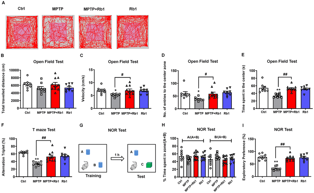 We conducted open-field to examine the general locomotor activity levels, anxiety, and willingness to explore, and T-maze, novel-object recognition (NOR) tests to examine spontaneous alternation behavior, recognition, and working memory behavior. In the open-field test (Figure 8A–8E), the total distance traveled showed no obvious difference among these four groups (Figure 8B), however, Rb1 prevented MPTP-decreased the movement speed in the open field (F 3, 31 = 3.911, P = 0.0177, post-hoc P = 0.032; Figure 8C). In addition, Rb1 prevented MPTP-decreased the number of entries to the center (F 3, 31 = 4.530, P = 0.0096, post-hoc P = 0.0423; Figure 8D) and duration in the center (F 3, 31 = 12.15, P < 0.001, post-hoc P = 0.0001; Figure 8E). Less time in the center of the open field may also suggest MPTP-treated mice have elevated anxiety levels. To confirm the specific effects of Rb1 on working memory versus anxiety, we performed the elevated plus maze (EPM) test. However, we found that MPTP or Rb1 showed no obvious effects on the total distance, movement speed, number of entries to open arms and the time spent in the open arms (Supplementary Figure 2A–2D), suggesting that Rb1 may influence memory deficiencies rather than anxiety of MPTP-treated mice.