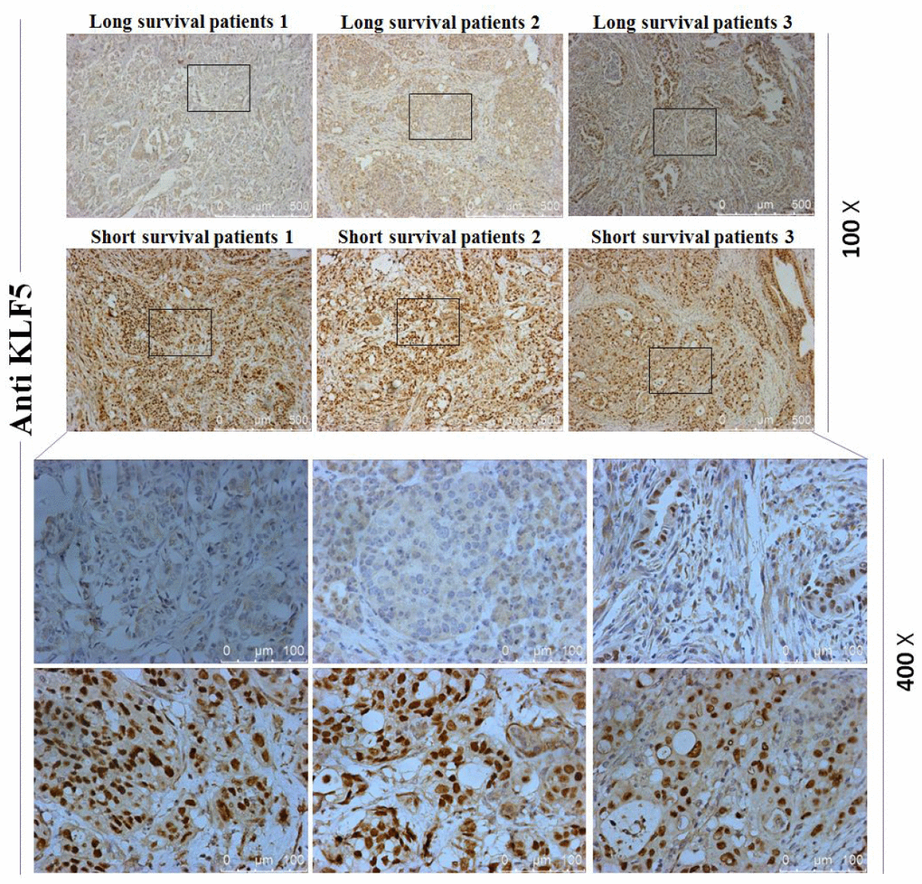To investigate whether the high or low KLF5 expression is a molecular event affecting survival of pancreatic cancer patients, mRNA array and immunohistochemical analyses were used to compare levels of KLF5 expression between tissues samples from three long-surviving and three short-surviving pancreatic cancer patients. The postsurgical survival times of the long-surviving patients were more than 5 years, while those of the short-surviving patients were less than 1 year. The heat map summarizing the mRNA array data shown in Figure 1A illustrates the significantly different expression profiles between the two patient groups. KLF5 was more highly expressed in tissues from the short-surviving patients than in those from the long-surviving patients. Moreover, the volcano plots in Figure 1B show that KLF5 expression is nearly 31 times higher in the tissue from short-surviving than long-surviving patients (P=0.0003). In addition, immunohistochemical staining for KLF5 protein was stronger in tissues from short-surviving than long-surviving patients (Figure 2), which is consistent with the mRNA array data.