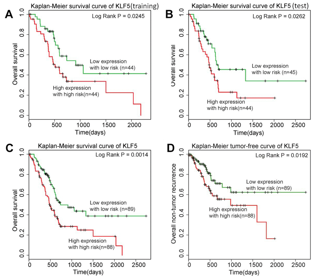 To determine whether KLF5 could be used as a prognostic biomarker in patients with pancreatic cancer, we built the risk score model described in the Methods section. Briefly, using a dataset for 177 pancreatic cancer patients from TGCA, we randomly assigned patients to a training group (n = 88) or a test group (n = 89). Then using survival analysis, we divided patients in the training group into better and poorer survival subgroups and determined whether there was a significant difference in KLF5 expression between the two subgroups (Figure 3A). We found that patients exhibiting high KLF5 expression had shorter survival times than those exhibiting low KLF5 expression. We then confirmed that KLF5 expression could be used to divide patients in the test group into better and poorer survival subgroups using the same cut-off point as in the training group (Figure 3B). In the test group, patients showing low expression of KLF5 had longer survival times than those showing high expression of KLF5. Finally, KLF5 expression was used to divide all 177 patients into better and poorer survival groups (Figure 3C). These results indicate that the KLF5 expression level is indicative of the postsurgical survival time in pancreatic cancer patients. The KLF5 expression level thus appears to be a prognotic biomarker in patients with pancreatic cancer.