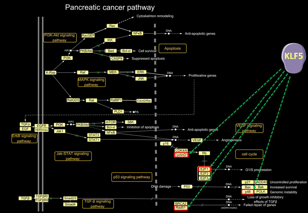 The pancreatic cancer pathway extracted in KEGG is a comprehensive pathway that includes the PI3K-Akt, MAPK, ErbB, Jak-STAT, VEGF, p53, and TGF-β signaling pathways, as well as the cell cycle and apoptosis pathways. A detailed examination of KLF5’s target genes within the pancreatic pathway map is shown in Figure 4. KLF5-activated genes include cyclin D1, E2F1, p48 and Rad51. Upregulation of these genes led to G1/S progression, uncontrolled proliferation, increased survival, genomic instability and failed repair of genes.
