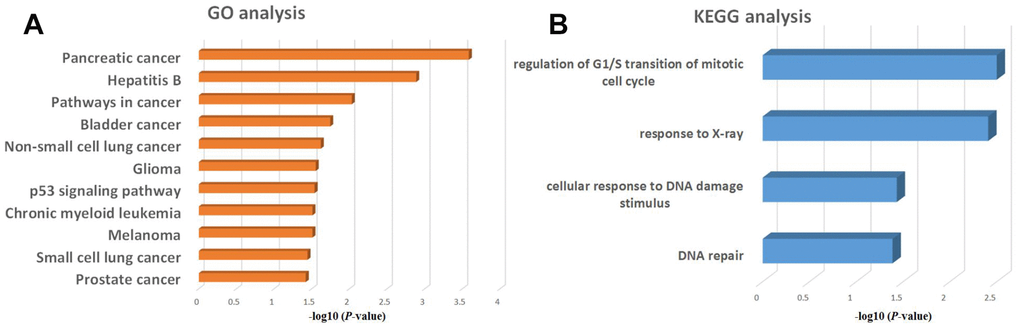 To gain additional insight into the functional roles of genes activated by KLF5, we performed GO and KEGG functional enrichment analyses for cyclin D1, E2F1, p48 and Rad51. GO analysis revealed that these four genes were associated with a variety of cancers, especially pancreatic cancer (Figure 6A). In a KEGG analysis, these four genes were associated with regulation of G1/S transition of the mitotic cell cycle, response to X-ray, cellular response to DNA damage, and DNA repair (Figure 6B).