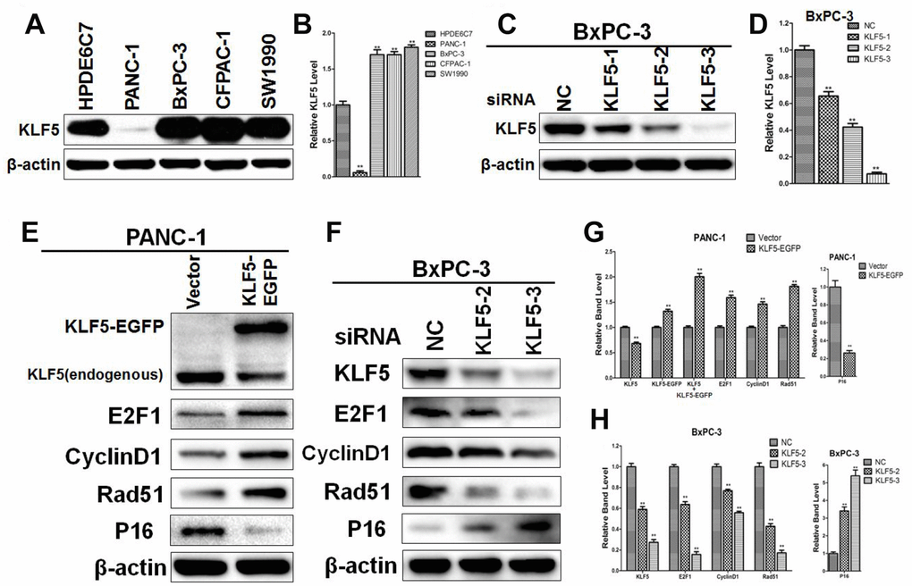 The following antibodies were used: anti-β-actin (Santa Cruz Biotechnology, Carlsbad, CA, USA), anti-KLF5, anti-E2F1, anti-cyclin D1, anti-Rad51, and anti-p16 (Proteintech, Chicago, IL, USA).