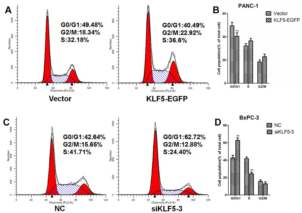 To investigate whether KLF5 expression level affects the cell cycle, we performed a flow cytometric analysis of the cellular DNA content. We found that overexpressing KLF5-EGFP promoted G1/S progression in PANC-1 cells (Figure 9A and 9B). Conversely, knocking down endogenous KLF5 expression using siKLF5-3 led to cell cycle arrest at G1 phase in BxPC-3 cells (Figure 9C and 9D). Similar results were also obtained using CCK8 assays (Supplementary Figure 8). KLF5-EGFP overexpression promoted PANC-1 cell proliferation, while KLF5 knockdown inhibited BxPC-3 cell proliferation.