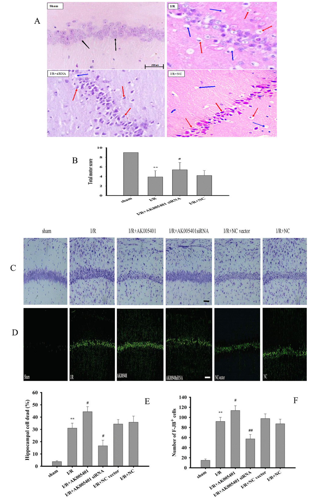 As shown in Figure 2, motor scores in the I/R group were significantly lower than those in the sham group (P < 0.01), although such deficits were attenuated by treatment with AK005401 siRNA (Figure 2B, P < 0.05). We then assessed the histopathological changes of neurons, in hippocampus tissues after treatment with I/R, inhibition or overexpression of AK005401 expression. No significant morphological changes were observed in neurons of the sham group. However, neurons in the I/R and NC siRNA oligos groups exhibited significant degeneration, swelling, atrophy, vacuolization and high mortality (P < 0.01), which were aggravated by Overexpression of AK005401(P < 0.05). Treatment with AK005401siRNA significantly attenuated such morphological changes and decreased cell death (P < 0.05 or P < 0.01).
