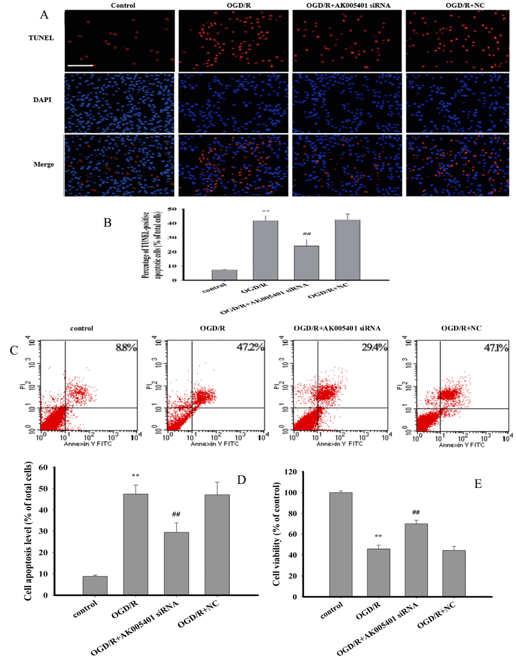 As shown in Figure 3, oxygen-glucose deprivation/reoxygenation (OGD/R) significantly reduced cell viability, increased the number of TUNEL-positive apoptotic cells, and enhanced the percentage of viable apoptotic cells, relative to findings observed in control mice (P < 0.01). However, treatment with AK005401 siRNA effectively attenuated OGD/R-mediated cell injury by increasing cell activity and reducing the apoptosis of exposed cells (P < 0.01).