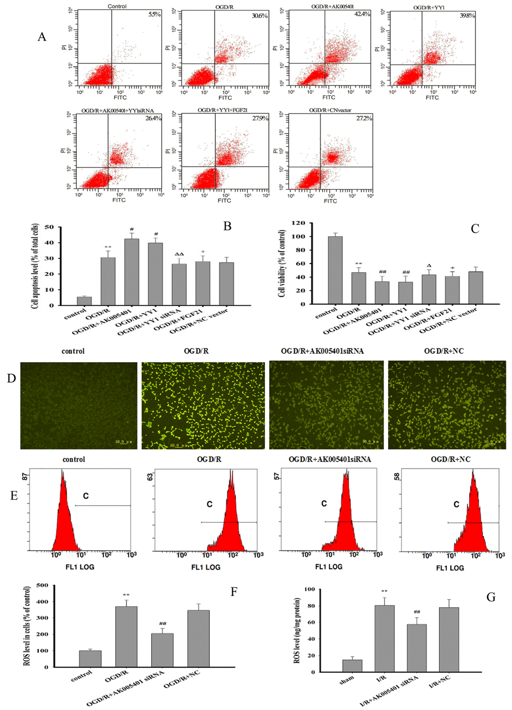 HT22 cells were kindly provided by Professor Chunxiang Zhang (Department of Pharmacology, Rush University, USA). HT22 cells were cultured in high-glucose DMEM supplemented with 10% FBS and maintained at 37°C in a humidified mixture of air (95%) and CO2 (5%) (v/v). When monolayer cells had spread to more than 80% of the culture dish, cells were collected and seeded in a 96-well plate or 6-well plate (Costar, Cambridge, MA, USA) and divided into nine groups as follows: control, oxygen-glucose deprivation and reoxygenation (OGD/R), OGD/R +AK005401 siRNA, OGD/R+AK005401 (OGD/R+ AK005401 overexpression vector), OGD/R+YY1 siRNA (OGD/R + AK005401 overexpression vector +YY1 siRNA), OGD/R+YY1 (OGD/R+ YY1 overexpression vector), OGD/R+FGF21 (OGD/R + YY1 overexpression vector +FGF21 overexpression vector), OGD/R+NC (OGD/R+negative control RNA) and OGD/R+NC vector (OGD/R+negative control vector) groups. After a 24-hour treatment period, all groups other than the control group were cultured in glucose-free DMEM under hypoxic conditions (1% O2: 94% N2: 5% CO2) at 37°C for 4 hours. Thereafter, media were replaced with normal DMEM for all groups, and culturing continued for 20 hours to ensure reoxygenation under normoxic conditions (95% air: 5% CO2). An identical volume of vehicle was added at the same time in the control group.