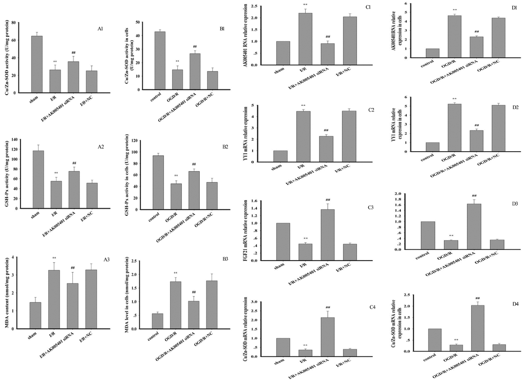 As shown in Figure 4D–4F, OGD/R markedly promoted ROS generation (P < 0.01). However, treatment with AK005401 siRNA significantly inhibited OGD/R mediated ROS production (P < 0.01). As shown in Figures 4G, 5A1–5A3, 5B1–5B3, Relative to values observed in the sham and control groups, I/R and OGD/R markedly decreased the activity of Cu/Zn superoxide dismutase (Cu/Zn-SOD) and GSH-Px, stimulated ROS generation and increased levels of MDA in vitro and in vivo (P < 0.01), respectively. As shown in Figures 4G, 5A1–5A3, 5B1–5B3, AK005401 siRNA significantly increased the activity of antioxidant enzymes, inhibited ROS production, and decreased levels of MDA (P < 0.01).