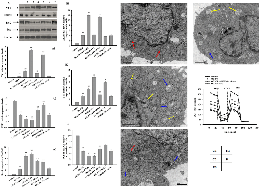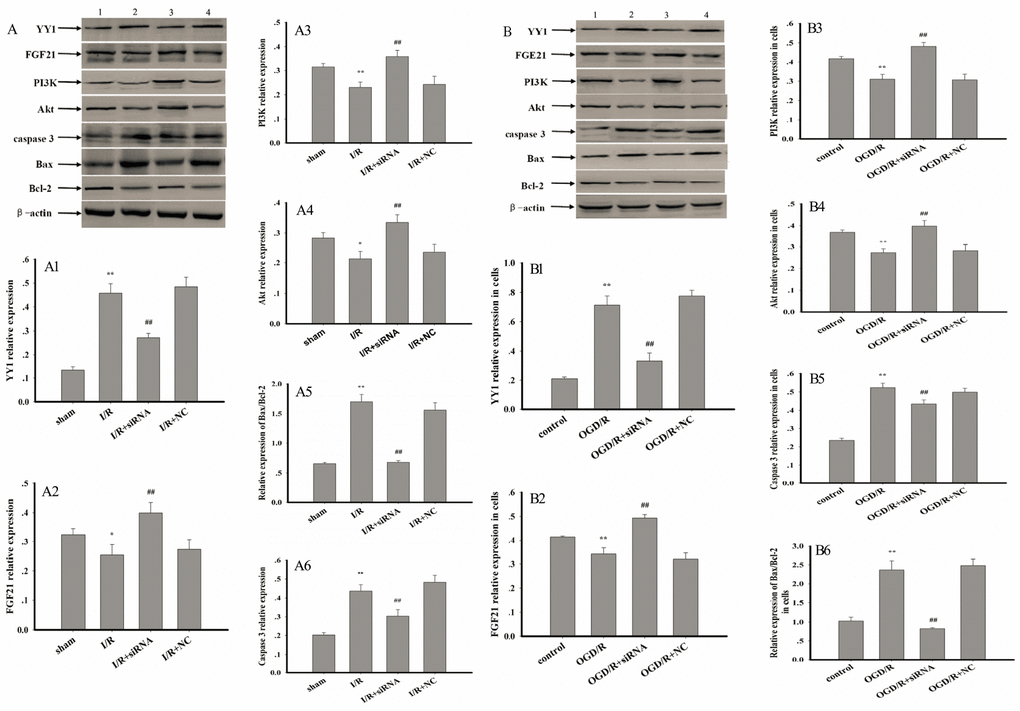 Relative to values observed in the sham and control groups, I/R and OGD/R significantly increased the expression of YY1, caspase 3, and Bax via upregulation of AK005401 expression in vitro and in vivo, respectively. Furthermore, I/R and OGD/R significantly suppressed the expression of FGF21, PI3K, Akt, and Bcl-2 in vitro and in vivo (Figure 6, P < 0.05 and P < 0.01), respectively. As shown in Figure 6, AK005401 siRNA significantly promoted the expression of FGF21, PI3K, Akt, and Bcl-2 and reduced the expression of YY1, caspase 3, and Bax by blocking the regulatory functions of AK005401 (P < 0.01). As shown in Figure 7A-A3, compared with OGD/R group, overexpression of AK005401and YY1 significantly increased YY1expression and the ratio of Bax/Bcl-2, decreased FGF21 expression (P < 0.05 and P < 0.01). YY1 siRNA remarkably decreased YY1expression and the ratio of Bax/Bcl-2, enhanced FGF21 expression compared to OGD/R+AK005401 group (P < 0.05 and P < 0.01). Overexpression of FGF21 significantly inhibited YY1expression and the ratio of Bax/Bcl-2 compared to OGD/R+YY1 group (P < 0.01).