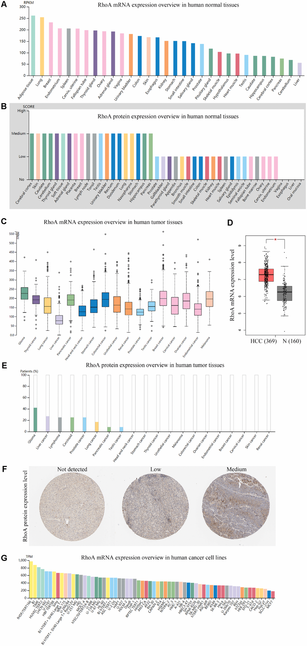 By examining the RhoA expression profile in the HPA, we found that the RNA expression of RhoA in the normal liver tissue samples was the lowest compared with that in the other 30 human tissue samples (Figure 1A), and the protein level of RhoA was nearly undetectable in hepatic tissues (Figure 1B). As Figure 1C shows, the level of RhoA in the HCC tissue samples was relatively low among the 17 carcinoma types; however, the expression of RhoA was found to be significantly upregulated in HCC tissues compared with that in normal tissues (Figure 1D). Interestingly, regarding RhoA protein expression, liver cancer exhibited a high positive rate, which ranked second among the positive expression rates of 20 common cancer types (Figure 1E). Figure 1F displays representative IHC images of the distinct RhoA expression levels, including undetected, low, and medium. In addition, Hep G2, which is a frequently used hepatic carcinoma cell line, had a similar RhoA expression pattern as that of the liver cancer tissue shown in Figure 1C, as identified by the Cancer Cell Line Encyclopedia (CCLE) web searching tool. Hence, the RhoA protein level, rather than the gene expression level, may be a more sensitive biomarker to diagnose HCC.