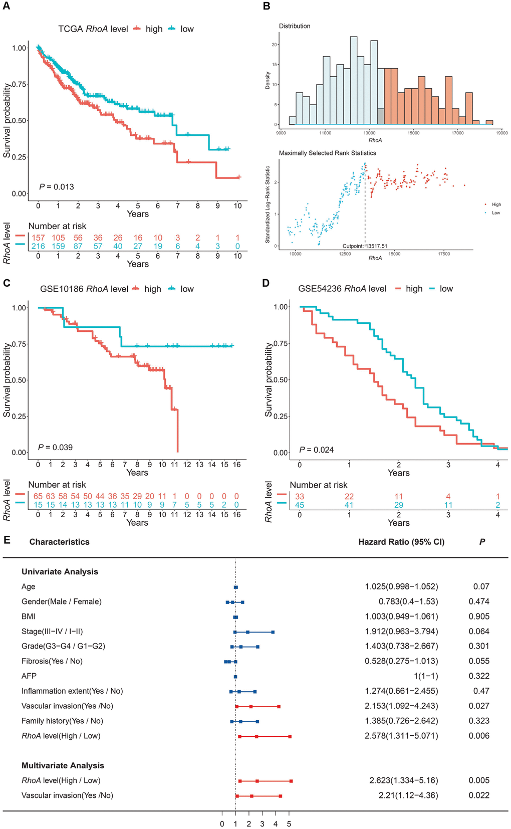 To explore the association between RhoA mRNA expression and OS in liver cancer patients, we performed Kaplan-Meier survival analysis based on data from TCGA. The results indicated that the HCC patients with high RhoA expression had poorer prognoses (Figure 2A). Notably, the optimal cutoff point of RhoA mRNA expression was calculated based on the X-tile method, which can produce the optimal cutoff value to predict survival time (Figure 2B). Moreover, the tumor-promoting role of RhoA was also demonstrated by two genomic spatial event (GSE) datasets (GSE10186 and GSE 54236), in which the P values were 0.039 and 0.024, respectively (Figure 2C and Figure 2D).