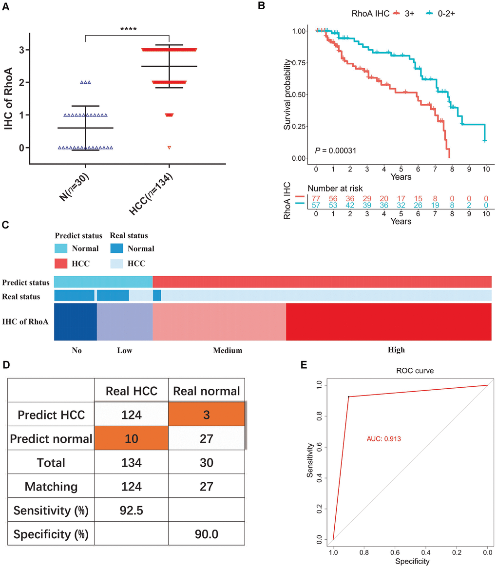 Here, using bioinformatics data mining, we found that both the gene and protein levels of RhoA were differentially expressed between liver cancer tissues and adjacent normal tissues, which indicated the potential of RhoA as a diagnostic biomarker. Analysis of The Cancer Genome Atlas (TCGA) data suggested that higher RhoA gene expression was associated with poorer prognosis, and similar patterns were also observed in two additional Gene Expression Omnibus (GEO) cohorts. The protein expression, but not the mRNA level, of RhoA varied greatly between liver cancer tissues and normal tissues, making it possible to build not only a prognostic model but also a diagnostic model, which was validated in a Peking Union Medical College Hospital (PUMCH) cohort with 30 normal tissue samples and 134 HCC samples.