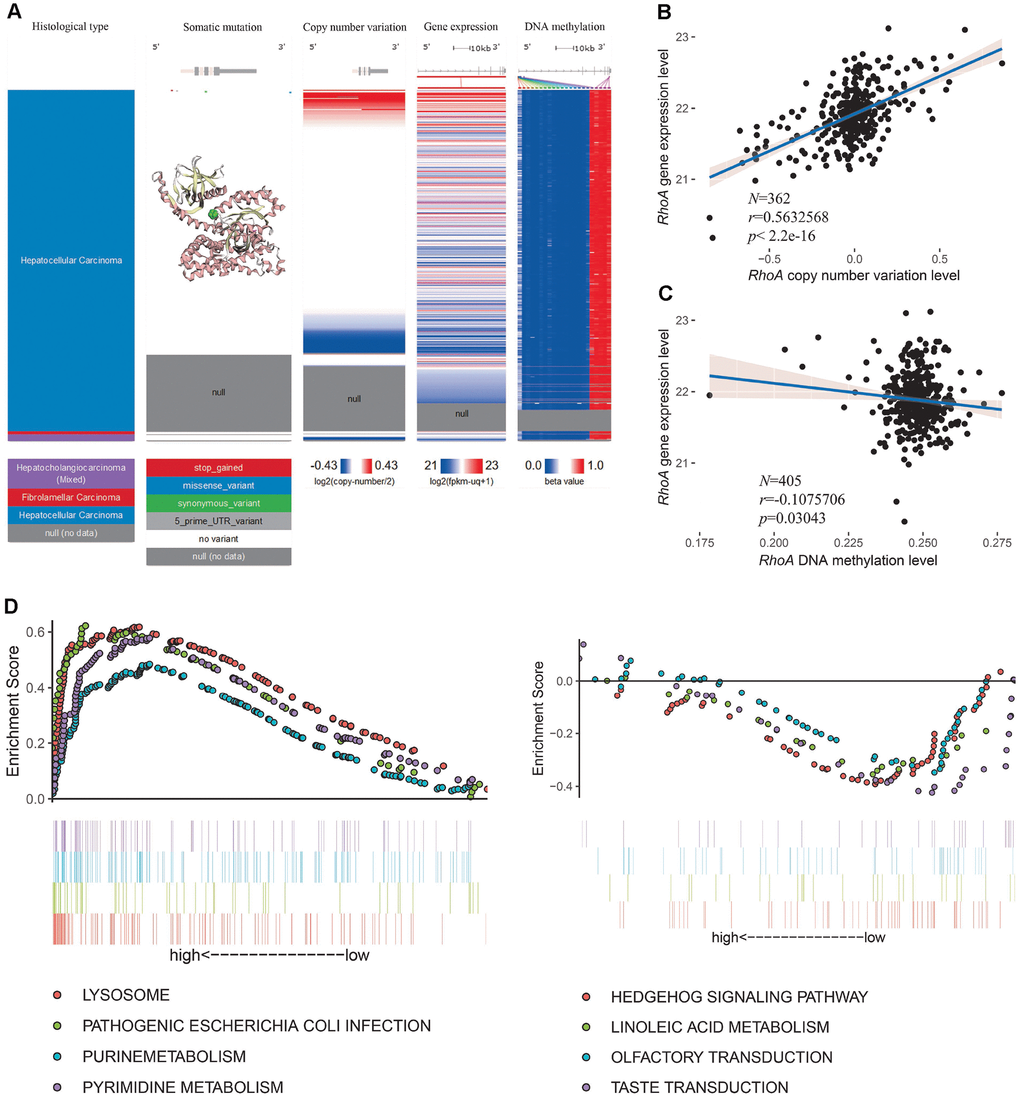 The essential position occupied by RhoA in the cancer cellular signaling pathway network has emphasized the importance of RhoA in cancer pathophysiology, and the intrinsic characteristics of RhoA make RhoA a great potential distinguished diagnostic and prognostic biomarker for liver cancer. As described before, instead of acting solely as a cancer indicator, RhoA also acts as a functional regulator. We next explored the dysregulation mechanism of gene expression via multiomics analysis. The results showed that the copy number amplification of RhoA mainly contributed to its increased gene expression, which may be a potential therapeutic target for HCC. The predominant KEGG pathways in the high RhoA level group and the low RhoA level group were further identified by using GSEA to reveal potential differential signaling pathways.