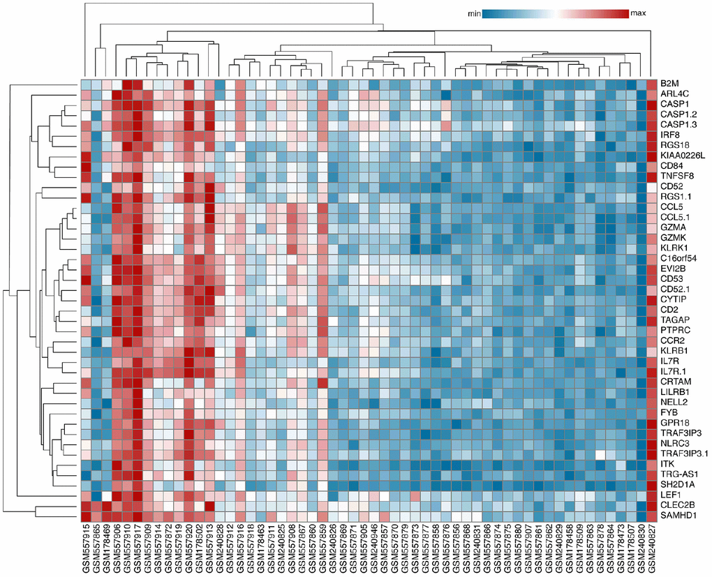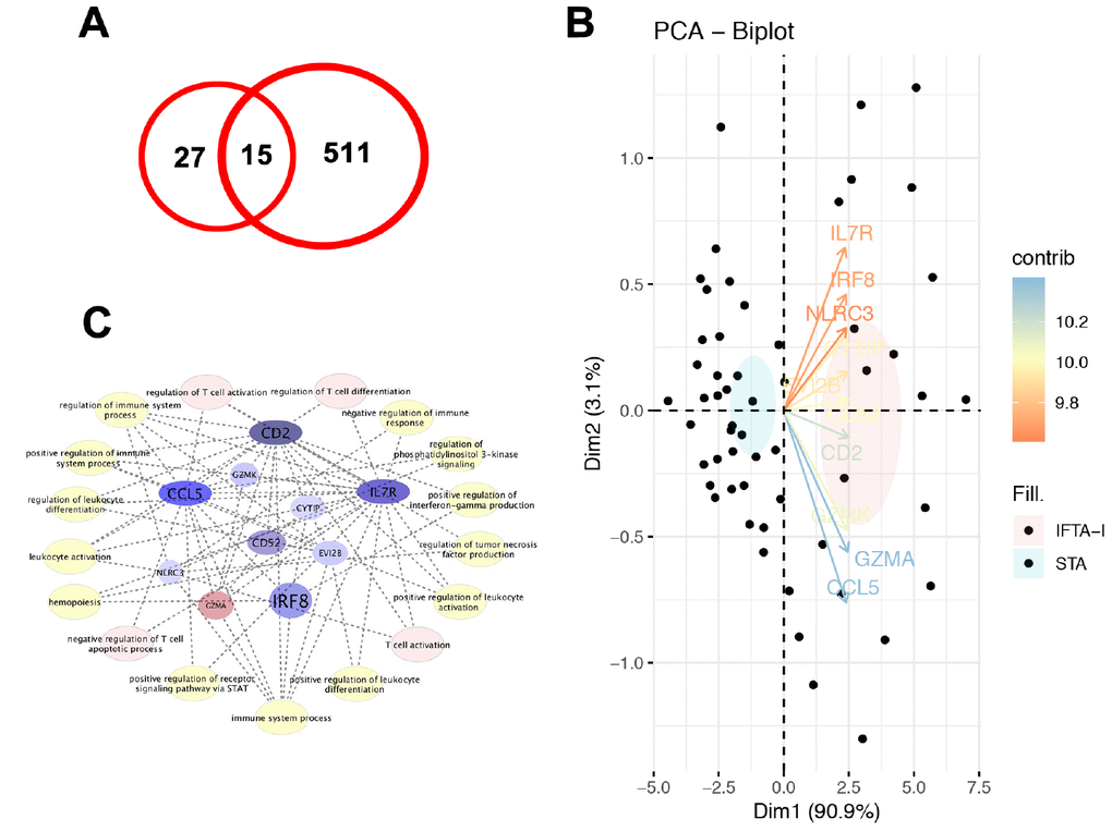 With a similar method, a total of 526 DEGs were identified in GSE 76882, and 15 common DEGs which were up-expressed or down-expressed simultaneously in both databases (Figure 2A). Principal component analysis (PCA) found that 10 transcripts, including EVI2B, CYTIP, GZMK, CD2, IRF8, IL7R, CD52, NLRC3, GZMA and CCL5, the contribution degrees were all > 0.9 (Figure 2B).