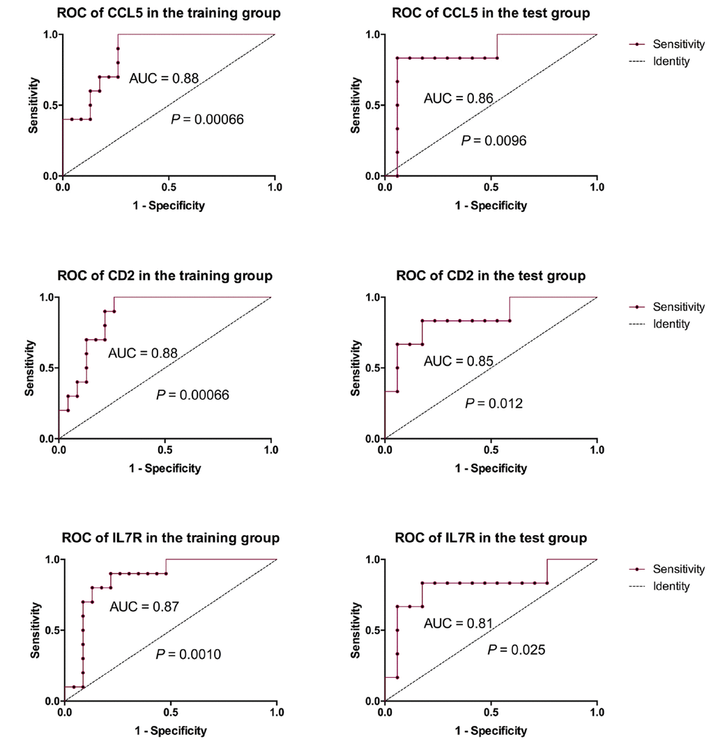 In the PPI analysis, we found that plug-in Molecular Complex Detection (MCODE) scores of CD2, IL7R, and CCL5 were all > 3 and the numbers of their nodes were all > 4. Also, those 3 genes were enriched in the most abundant signals, including T cell activation, regulation of T cell activation and differentiation and negative regulation of T cell apoptotic process and so on (Figure 2C). ROC analysis showed that AUC of CD2, IL7R, and CCL5 in both training and test groups were all > 0.8 (Figure 3).