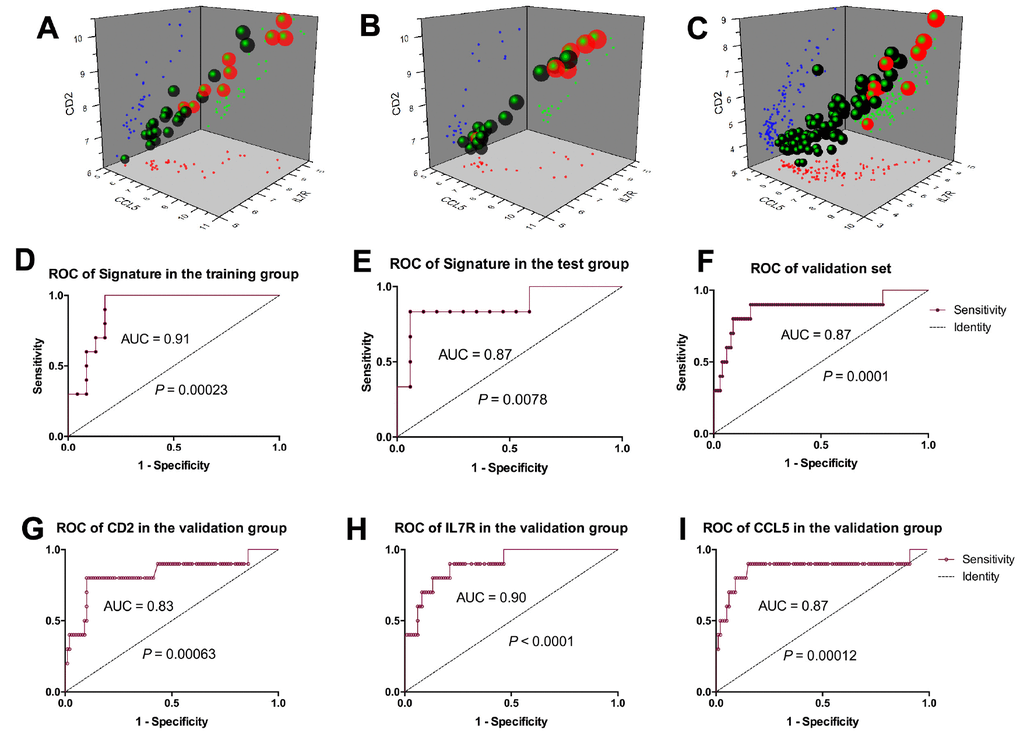 Scatter diagram of the validation group showed the subjects with higher prognostic scores showed a tendency towards expression of high-risk transcripts (Figure 4C). ROC curve of the validation group revealed that the AUC of 3-gene signature was 0.87 (P = 0.0001, Figure 4F), CD2, IL7R and CCL5 were 0.83 (P = 0.00063), 0.90 (P < 0.0001) and 0.87 (P = 0.00012) respectively (Figure 4G–4I).