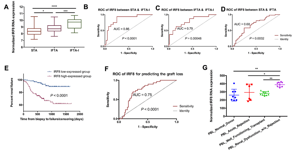Though we confirmed that the significant prognosis role of IRF8 in the renal graft recipients IFTA with or without inflammation, our study was limited because the number of kidney transplantation recipients was small, the study was retrospective, and the underlying pathological mechanisms of the genes identified remain speculative. Ultimately, the prognostic potential of the IRF8 should be further tested prospectively in a larger analysis of kidney transplant recipients before wider application.