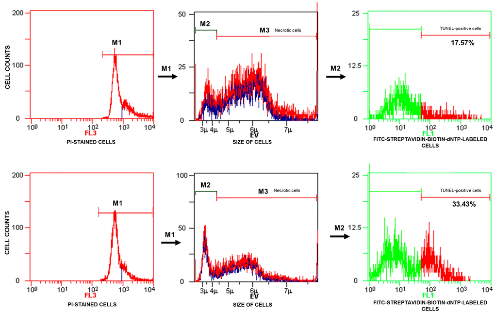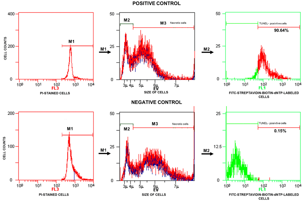 The TUNEL test was based on the incorporation of substrate, biotin-labelled deoxynucleotide triphosphate (biotin-dNTP), into the free 3’-OH residues of the DNA fragments in the presence of terminal deoxynucleotidyl transferase (TdT). DNA breakage in the insertion sites of biotin-dNTP was identified by means of fluorescein isothiocyanate (FITC)-labelled streptavidin with a strong affinity for biotin. A negative control was obtained by omitting TdT from the reaction mixture, and a positive control was obtained by incubating sperm cells with DNase I. The TUNEL-positive spermatozoa (FITC-streptavidin-biotin-dNTP-labelled cells) were checked with a fluorescence microscope (BX41 Olympus Optical Co., Tokyo, Japan). After the TUNEL labelling reaction, previously permeabilized sperm cells (0.1% Triton X-100 in 0.1% sodium citrate) were stained with propidium iodide (PI) to discriminate apoptotic cells from necrotic cells in the flow cytometry analysis.