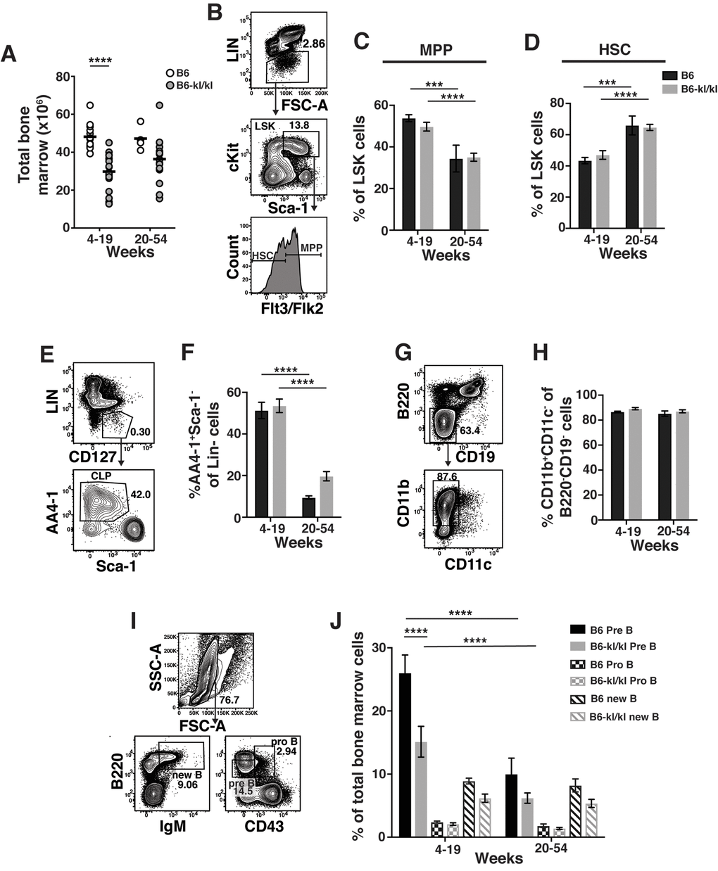 We sought to determine the effect of Klotho on immune cell development and maintenance in adult mice. We divided adult mice into young-adult (young-4-19 weeks) and older-adult (old-20-54 weeks) group. Total number of BM cells recovered from B6-kl/kl mice were significantly reduced in young-adult and older-adult B6-kl/kl mice compared to age-matched C57BL/6 mice (Figure 2A). This reduction in cell number is most likely due to the overall smaller size of the B6-kl/kl mice (Figure 1B and C). As mice age the frequency of multi-potential progenitors (MPP) and short-term HSCs increase [2]. These age-related changes were not affected by decreased Klotho expression as B6-kl/kl mice did not show differences in the frequency of MPPs or HSCs compared to age-matched C57Bl/6 mice (Figure 2B, C and D). Importantly, the comparable age-associated loss of MPPs and gain of HSCs in both C57Bl/6 and B6-kl/kl mice indicate normal maintenance with age in adult mice. Common lymphoid progenitors (CLPs) were also present in similar frequencies in the B6-kl/kl mice compared to the C57Bl/6 mice and showed an analogous and significant loss with age (Figure 2E and F). B6-kl/kl mice showed comparable myeloid cells in the bone marrow compared to C57Bl/6 mice (Figure 2G and H). There was a reduction in the frequency of pre-B cells in the young B6-kl/kl mice, but this did not affect B cell development as B cells, pro B cells and new B cell frequencies were not reduced (Figure 2I and J). Overall, in the B6-kl/kl BM, immune cells developed and were maintained at comparable frequencies to age-matched C57BL/6 mice.