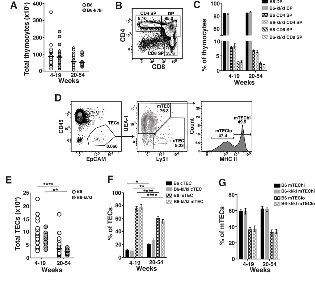 kl/kl allele on susceptible strains [C3H, BALB/c and 129], results in several acute effects on the immune system. The thymus is essentially absent in C3HxC57BL/6-kl/kl mice within a few weeks of birth [19] and deficits in B cell lymphopoieisis are noted after 2-weeks of age [22], when the detrimental effects of increased vitamin D levels in serum are the highest [33]. This suggests that the decrease in thymus size and B cell phenotype could be secondary to high vitamin D levels in the serum. Germline deletion of Klotho [on 129 genetic background] results in induction of erythropoietin (Epo) production in the kidney, which in turn induces abnormal generation of erythrocytes in the BM and subsequently in the spleen [23]. These phenotypes were not observed in B6-kl/kl mice. Unlike in the recently reported 129xC57BL/6-kl/kl mice [21], TEC populations and T cell development in B6-kl/kl mice thymus were also unaffected. These observations support the notion that the effects of Klotho-deficiency on the immune system could be attributed to systemic stress resulting from altered metabolic events, especially serum vitamin D levels. The observation that thymic involution and changes in the BM proceeded comparably in young-adult B6 and B6-kl/kl mice, taken with comparable presence of immune cells in the peripheral organs in young-adult and older-adult B6 and B6-kl/kl mice, suggest that immune system development and maintenance was normal in the absence of Klotho expression.