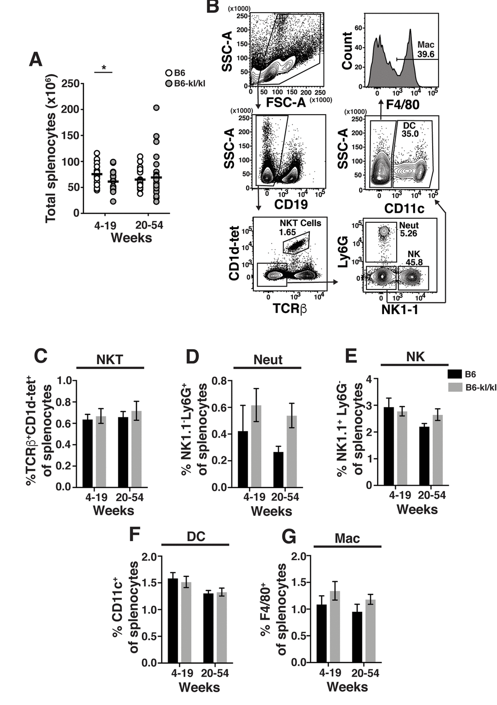 Innate and adaptive immune cell maintenance in the spleen of B6-kl/kl mice