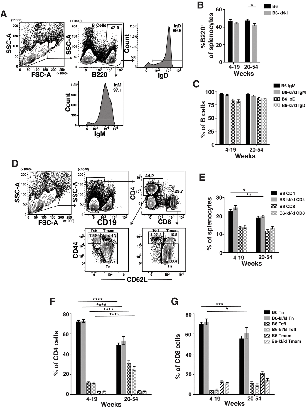 The spleens from B6-kl/kl mice were neither visibly abnormal nor hypercellular and demonstrated no enhanced erythropoiesis as noted in Klotho-deficient 129 mice [23] (Figure 4A). In the young B6-kl/kl there was a small reduction in the number of splenocytes compared to the C57Bl/6 mice, which was ameliorated with age and therefore did not represent a defect in maintenance of immune cells (Figure 4A). The overall assessment of the innate immune cells in the spleen included natural killer T cells (NKT), neutrophils (Neut), natural killer cells (NK), dendritic cells (DC), and macrophages (Mac) (Figure 4B). The frequency of these cell populations was comparable in the young-adult and older-adult B6-kl/kl mice compared to C57BL/6 mice (Figure 4C-G). There was a small but significant reduction in the frequency of B cells in the spleens of older-adult B6-kl/kl mice compared to C57BL/6 mice (Figure 5A and B), but no differences in frequency of IgD+ or IgM+ B cells (Figure 5C). B6-kl/kl had comparable frequency of naïve (Tn), effector-phenotype (Teff), and memory-phenotype (Tmem) T cells in both CD4 and CD8 T cell compartments compared to C57BL/6 mice (Figure 5D-G). Together these data demonstrate that adaptive and innate immune systems remained unaffected by decreased Klotho expression in the spleen of B6-kl/kl mice.