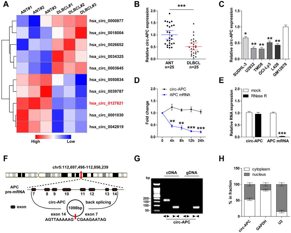 To search for differentially expressed circRNAs in DLBCL, we analyzed the circRNA microarray expression profiles of three pairs of DLBCL and para-carcinoma tissues (Figure 1A). We selected circ-APC (hsa_circ_ 0127621) for further investigation because its expression differed the most between DLBCL and para-carcinoma tissues. A quantitative real-time PCR (qRT-PCR) analysis demonstrated that circ-APC was significantly downregulated in DLBCL tissues compared with adjacent normal tissues, consistent with the findings of the circRNA microarray (Figure 1B). Likewise, circ-APC expression was lower in five DLBCL cell lines than in GM12878 normal human B lymphocytes (Figure 1C).
