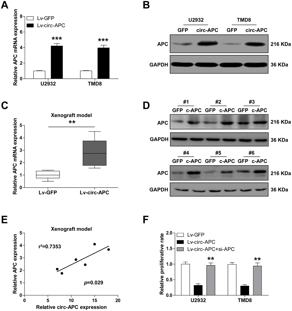 Given that circRNAs can alter the expression of their host genes and thereby participate in disease progression [11], we wondered whether circ-APC upregulated APC. As expected, overexpression of circ-APC remarkably increased APC mRNA and protein expression in both U2932 and TMD8 cells (Figure 3A, 3B). Importantly, the same effects on APC expression were observed in the tumors of the xenografted mice injected with circ-APC-overexpressing U2932 cells (Figure 3C, 3D). There was a strong positive correlation between circ-APC expression and APC expression in the circ-APC-overexpressing subcutaneous tumors (r2=0.7353, p=0.029, n=6) (Figure 3E).